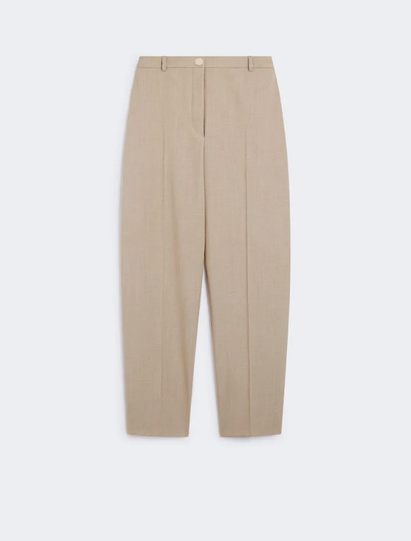 Men’s-style trousers, made of natural stretch wool plain-woven fabric. The construction mixes tailored details with casual touches, such as the press stud and elastic insert on the rear waist. - Straight trousers in natural stretch pure wool canvas. - Straight fit with slightly low waist and wide leg - Snap button closure, elastic insert on the rear of the waist - Slant side pockets and back welt pockets. - Trouser crease only on the front - Regular fit Composition and Care 100% virgin wool. Do not wash; do not bleach; do not tumble dry; cool iron; professionally dry clean perchloroethylene - mild process; do not wet clean.; put this item into a string bag before washing it.; wash the garment while it is fastened.; turn the articles inside out before washing. Distributed by Max Mara S.r.l., registered office in Reggio Emilia (Italy), Via Giulia Maramotti 4, 42124