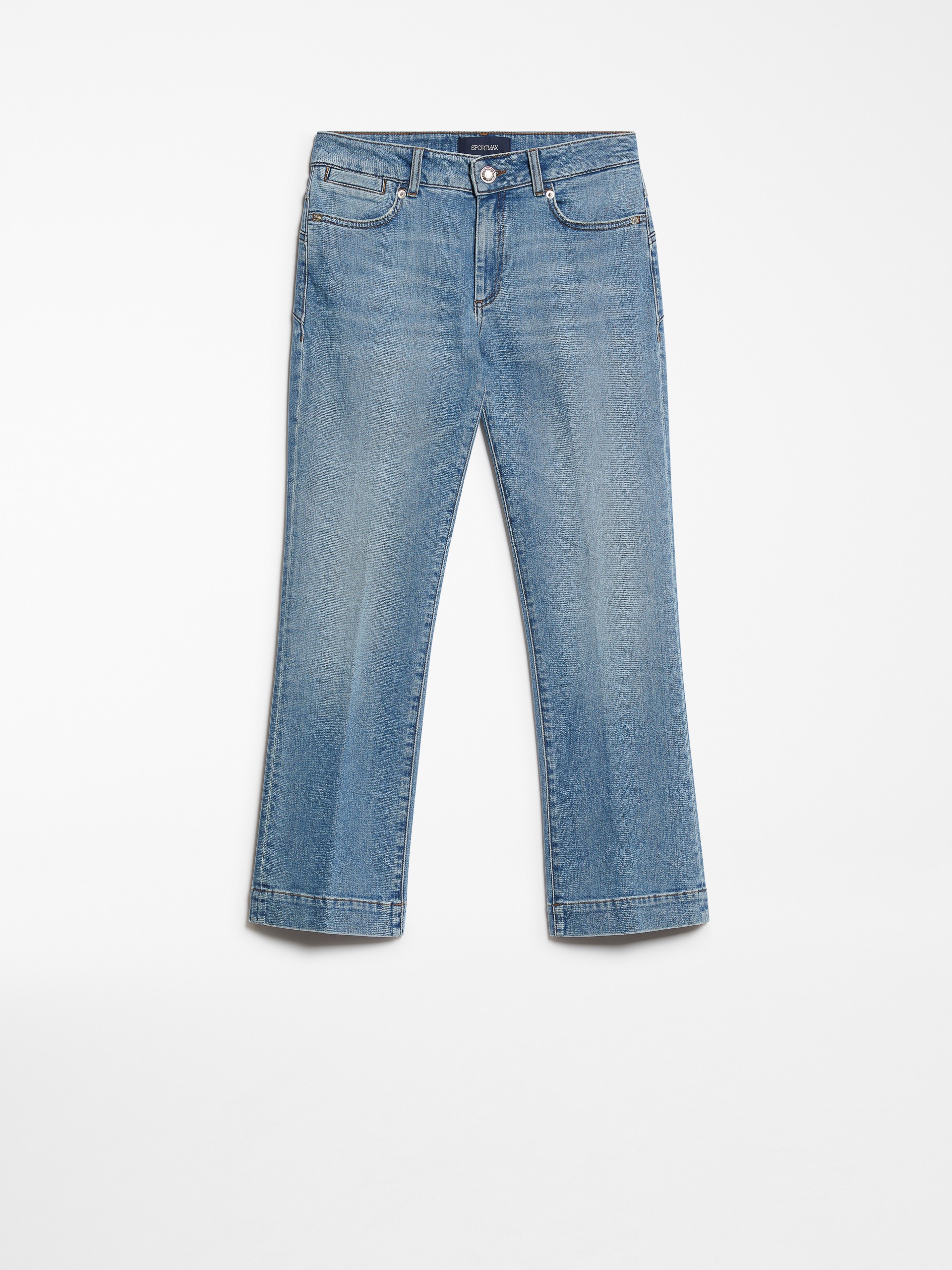 DETAILS Perfect-fit 5-pocket trousers in vintage mid-wash and distressed dark-wash authentic indigo stretch denim fabric. The low-rise model boasts a mini flare leg cut, in addition to a cropped length and pressed pleat detail on the front and back. The original details – such as the contrasting tobacco-coloured topstitching, and the branded metal rivets and button – add the finishing touches. COMPOSITION AND CARE 99% cotton, 1% elastane. Machine wash cold delicate cycle; do not bleach; do not tumble dry; line drying in the shade; cool iron; do not dry clean.; wash the garment while it is fastened.; do not iron the buttons.; take care when wearing light-coloured clothes or accessories because, with the heat of the body, the indigo fabric , may fade and stain. be careful while sitting on light coloured surfaces, especially if wet. wash garments separately and always turned inside out. hang the garment turned inside out by avoiding to expose it to direct sunlight. avoid removing isolated stains.; contains non-textile parts of animal origin. Distributed by Max Mara S.r.l., registered office in Reggio Emilia (Italy), Via Giulia Maramotti 4, 42124 (IT)