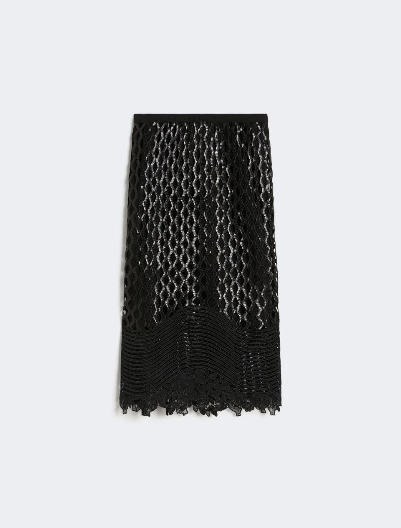 Slim-cut sequinned mesh skirt with a macrame insert-decorated hem. Lined style with ribbed cotton petticoat. Scalloped hem that follows the pattern. - Sequinned mesh skirt with a macrame trim - Slim cut - Elasticated waist - Ribbed cotton petticoat - Regular fit Composition and Care Jersey skirt jersey fabric 100% polyester; joining thread 100% polyester; - exclusive of decoration. Petticoat 95% cotton, 5% elastane. Jersey skirt: hand wash cold (40°c max); do not bleach; do not tumble dry; flat drying in the shade; do not iron; do not dry clean; do not wet clean.; Using neutral detergent.; Don’t rub. Petticoat: machine wash cold delicate cycle; do not bleach; do not tumble dry; flat drying in the shade; cool iron; professionally dry clean perchloroethylene - mild process; professional wet cleaning - very mild process.; Iron with a cloth between.; Using neutral detergent. Distributed by Max Mara S.r.l., registered office in Reggio Emilia (Italy), Via Giulia Maramotti 4, 42124
