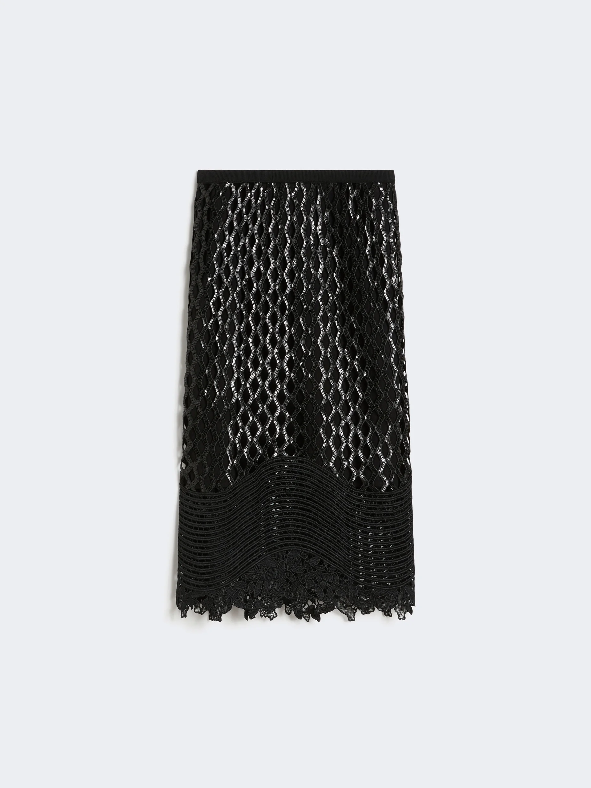 DETAILS Slim-cut sequinned mesh skirt with a macrame insert-decorated hem. Lined style with ribbed cotton petticoat. Scalloped hem that follows the pattern. - Sequinned mesh skirt with a macrame trim - Slim cut - Elasticated waist - Ribbed cotton petticoat - Regular fit COMPOSITION AND CARE Jersey skirt jersey fabric 100% polyester; joining thread 100% polyester; - exclusive of decoration. Petticoat 95% cotton, 5% elastane. Jersey skirt: hand wash cold (40°c max); do not bleach; do not tumble dry; flat drying in the shade; do not iron; do not dry clean; do not wet clean.; Using neutral detergent.; Don’t rub. Petticoat: machine wash cold delicate cycle; do not bleach; do not tumble dry; flat drying in the shade; cool iron; professionally dry clean perchloroethylene - mild process; professional wet cleaning - very mild process.; Iron with a cloth between.; Using neutral detergent. Distributed by Max Mara S.r.l., registered office in Reggio Emilia (Italy), Via Giulia Maramotti 4, 42124 (IT) Collection: Sportmax Product code: 2631036206004 - SPXSALA