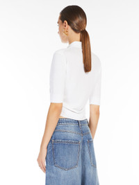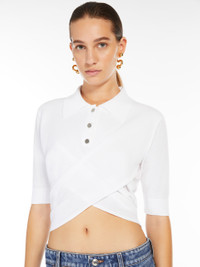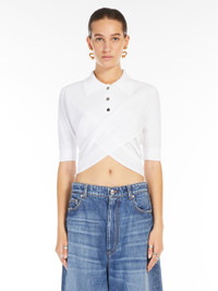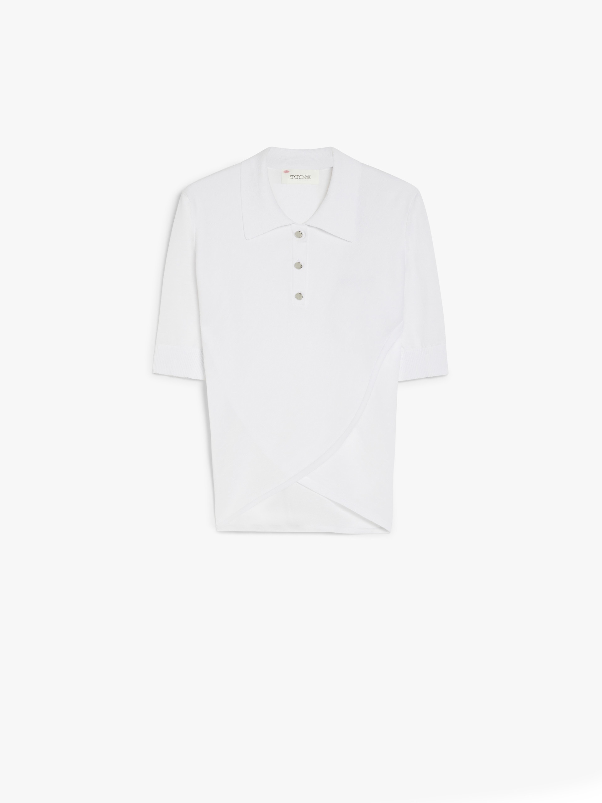 DETAILS Top made of pure cotton with a polo construction on the upper part and a crossover at the hem that cinches in the waist. The collar is completed with three customised metal buttons, with drop stitching on the shoulders and ribbed cuffs. Regular fit. COMPOSITION AND CARE 100% cotton. Hand wash cold; do not bleach; do not tumble dry; flat drying in the shade; cool iron; professionally dry clean perchloroethylene - mild process; do not wet clean.; iron with a cloth between.; using neutral detergent.; protect buttons before washing. Distributed by Max Mara S.r.l., registered office in Reggio Emilia (Italy), Via Giulia Maramotti 4, 42124 (IT)