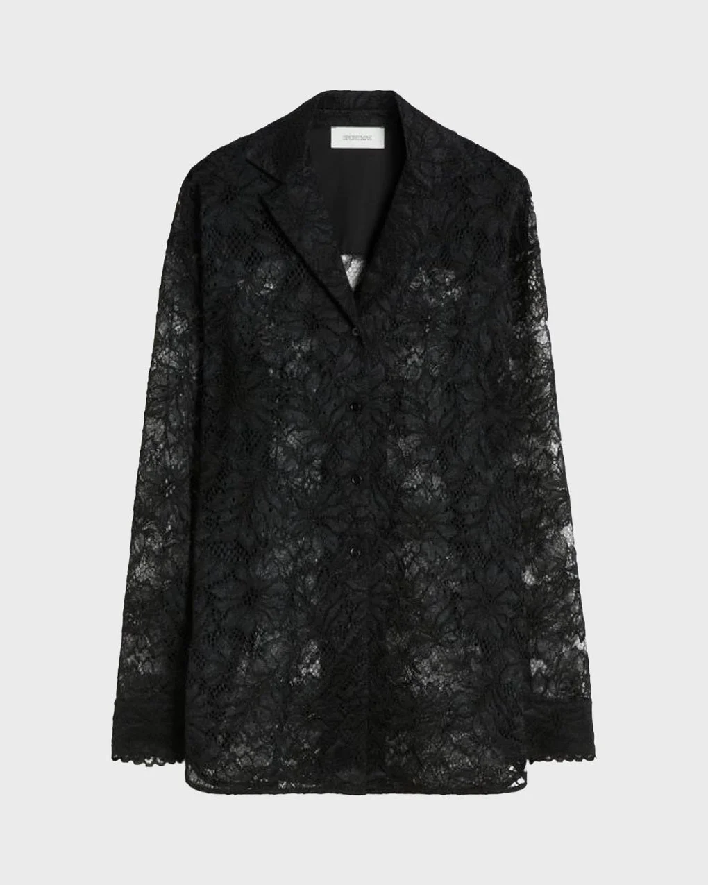 Shirt Floral Jersey from SPORTMAX. An oversized shirt crafted from rebrode floral lace, inspired by the classic dinner jacket. Designed with small lapels and a visible button fastening for a tailored expression. Poplin details on the inside of the neck, yoke, cuffs and fastening create subtle contrast. Deep rounded side slits add movement and a modern silhouette. Regular fit. Size and Fit - Fits true to size, choose your usual size - The model is 176 cm tall and is wearing size S Specification - Article number - ID: 177631-000 - Brand: Sportmax - Color: Black - Washing Instructions: Hand wash - Made of: Jersey fabric 100% polyester