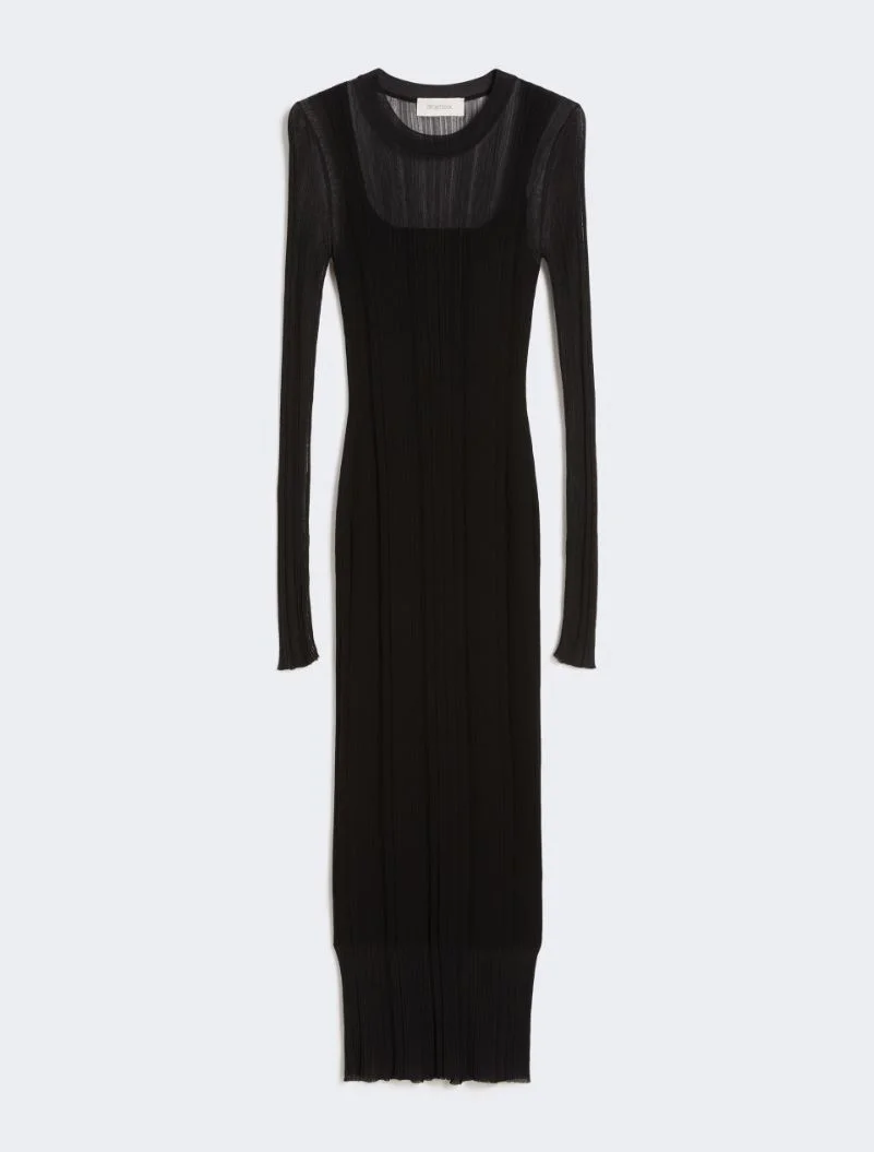 Dress in stretch viscose knit featuring a special semi-sheer and opaque texture for a trompe-l'œil effect. Short sleeves and a fitted cut enhance the silhouette. - Ribbed stretch viscose knit dress - Round neckline and short sleeves - Knit with trompe-l'œil effect resembling a layered tank-top design - Regular fit Composition and Care Knitted fabric 1 72% viscose, 28% polyester; knitted fabric 2 76% viscose, 24% polyamide. Hand wash cold (40°c max); do not bleach; do not tumble dry; flat drying in the shade; cool iron; professionally dry clean perchloroethylene - mild process; do not wet clean.; iron with a cloth between.; using neutral detergent. Distributed by Max Mara S.r.l., registered office in Reggio Emilia (Italy), Via Giulia Maramotti 4, 42124
