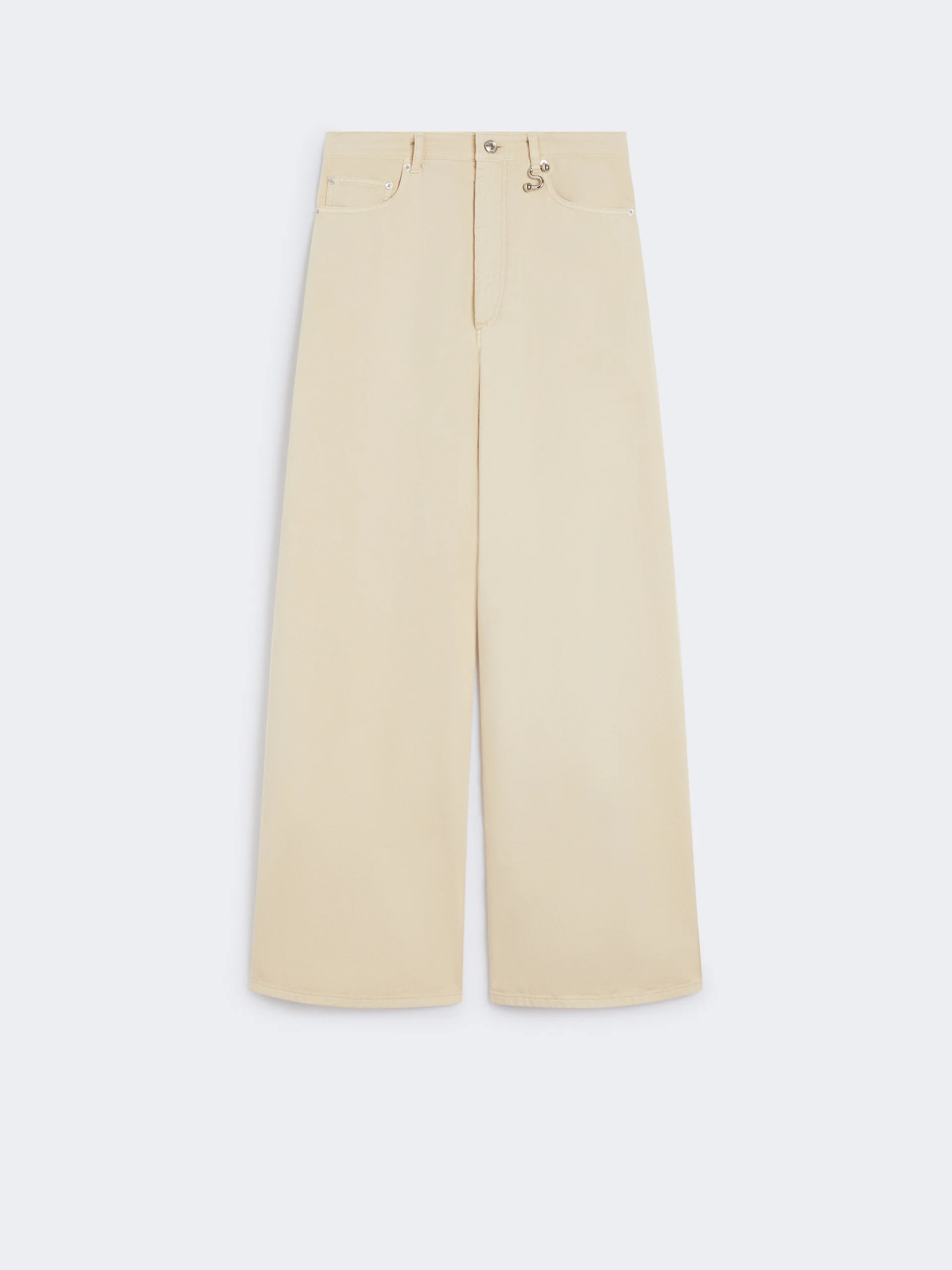DETAILS Wide and soft 5-pocket trousers in a garment-dyed cotton bull. The volume of the leg and the on-tone stitching details add an iconic note to the design. Five-pocket, garment-dyed, stretch bull cotton trousers. Oversize fit with low waist and low crotch 5 pocket construction with custom tack button On tone stitching, with pen holder on the back S-rivet loop on the front and personalized leather label Wide fit COMPOSITION AND CARE 100% cotton. Machine wash cold delicate cycle; do not bleach; do not tumble dry; line drying in the shade; cool iron; do not dry clean.; wash the garment while it is fastened.; do not iron the buttons.; turn the articles inside out before washing.; remove metal parts before washing.; this item may leave colour stains on brightly-coloured garments.; contains non-textile parts of animal origin. Distributed by Max Mara S.r.l., registered office in Reggio Emilia (Italy), Via Giulia Maramotti 4, 42124 (IT)