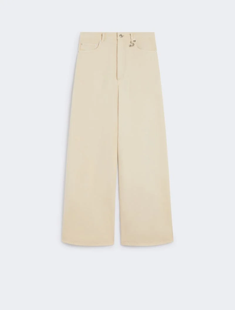Wide and soft 5-pocket trousers in a garment-dyed cotton bull. The volume of the leg and the on-tone stitching details add an iconic note to the design. - Five-pocket, garment-dyed, stretch bull cotton trousers. - Oversize fit with low waist and low crotch - 5 pocket construction with custom tack button - On tone stitching, with pen holder on the back - S-rivet loop on the front and personalized leather label - Wide fit Composition and Care 100% cotton. Machine wash cold delicate cycle; do not bleach; do not tumble dry; line drying in the shade; cool iron; do not dry clean.; wash the garment while it is fastened.; do not iron the buttons.; turn the articles inside out before washing.; remove metal parts before washing.; this item may leave colour stains on brightly-coloured garments.; contains non-textile parts of animal origin. Distributed by Max Mara S.r.l., registered office in Reggio Emilia (Italy), Via Giulia Maramotti 4, 42124