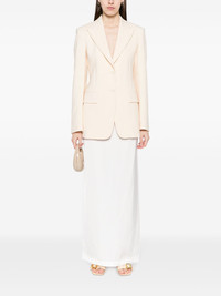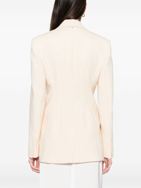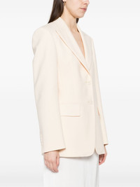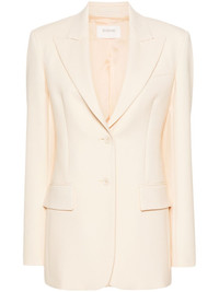single-breasted blazer Highlights - Beige - Virgin wool blend - Peak lapels - Shoulder pads - Long sleeves - Buttoned cuffs - Chest welt pocket - Fitted waistline - Faux pocket detail - Central rear vent - Internal logo tag - Full lining - Straight hem - Front button fastening Imported Composition Outer: Virgin Wool 96%, Elastane 4% Lining: Viscose 97%, Acetate 3% SIZE & FIT Model measurements Height 5 ft 11 in(1.8 m) Bust/Chest 31.49 in(80 cm) Hips 36.22 in(92 cm) Waist 25.59 in(65 cm) FittingInformation Designed for a slim fit that sits just away from the body offering a close yet comfortable fit The internal shoulder pads offer a structured shape Made from a midweight fabric This piece fits true to size – take your usual size Washing instructions Dry Clean Only