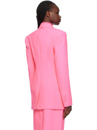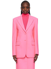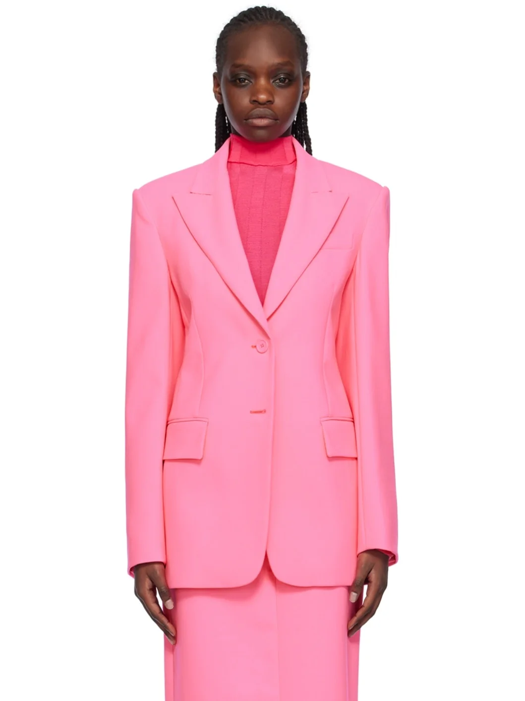 Stretch virgin wool canvas blazer. · Peaked lapel · Button closure · Welt pocket and flap pockets · Padded shoulders · Four-button surgeon's cuffs · Crystal-cut accent at back collar · Central vent at back hem · Full crepon and satin lining Supplier color: Fuchsia