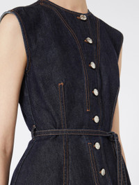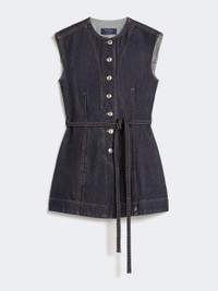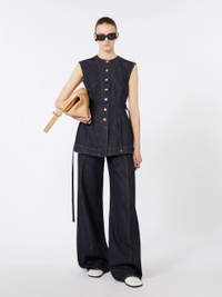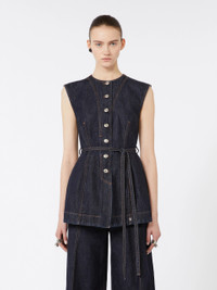 DETAILS Sleeveless top in authentic indigo denim, with a fitted silhouette and knotted belt at the waist to accentuate the figure. The S-shaped metal rivets add an iconic note to the design. - Authentic non-stretch indigo denim top, with medium vintage treatment - Slim-cut at the waist and flared at the hem - Rounded neckline and sleeveless line - Closure with customised metal buttons - Belted waist - Fitted COMPOSITION AND CARE 100% cotton. Machine wash cold delicate cycle; do not bleach; do not tumble dry; line drying in the shade; cool iron; professionally dry clean perchloroethylene - mild process.; wash the garment while it is fastened.; do not iron the buttons.; take care when wearing light-coloured clothes or accessories because, with the heat of the body, the indigo fabric , may fade and stain. be careful while sitting on light coloured surfaces, especially if wet. wash garments separately and always turned inside out. hang the garment turned inside out by avoiding to expose it to direct sunlight. avoid removing isolated stains. Distributed by Max Mara S.r.l., registered office in Reggio Emilia (Italy), Via Giulia Maramotti 4, 42124 (IT) Collection: Sportmax Product code: 2161016506001 - SPDDOMINIO