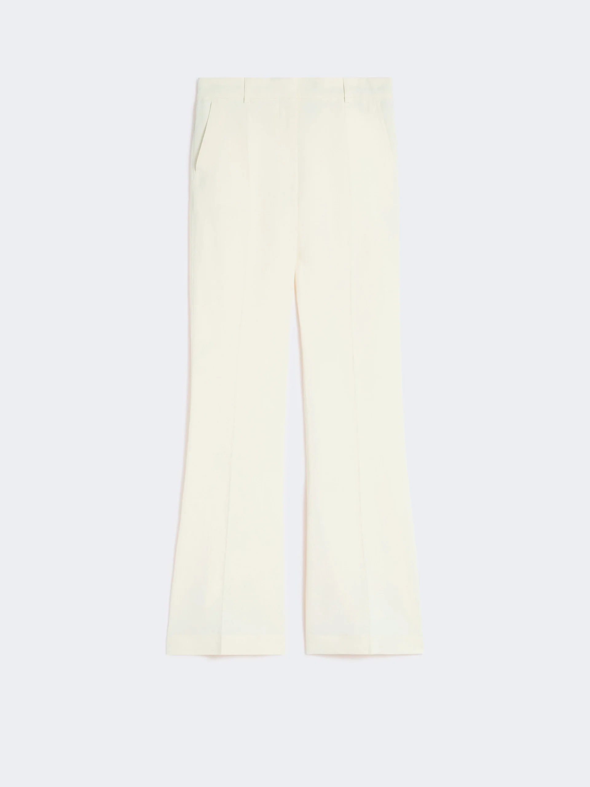 DETAILS Flared trousers with a slim fit and feminine cut. The construction is inspired by tailored styles, with covered lacing and trouser crease. The small overlapping rear slit further flares the leg. - Trousers in crisp-hand viscose canvas - Concealed mannish fastening - Customised internal belt and overlapping slits at the hem - Slant pockets on the sides and back pockets with wide welt - Regular fit COMPOSITION AND CARE 56% viscose, 44% paper. Do not wash; do not bleach; do not tumble dry; cool iron; professionally dry clean perchloroethylene - mild process; do not wet clean. Distributed by Max Mara S.r.l., registered office in Reggio Emilia (Italy), Via Giulia Maramotti 4, 42124 (IT) Collection: Sportmax Product code: 2131096206001 - SPXFRAGOLA