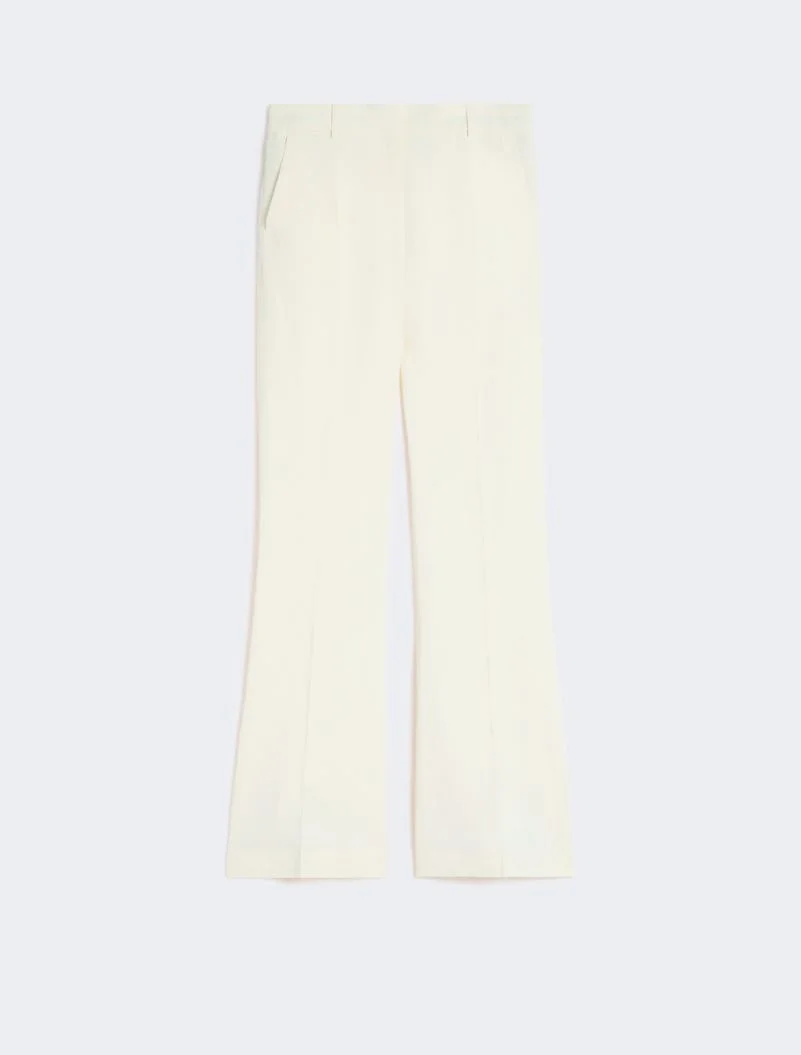 Flared trousers with a slim fit and feminine cut. The construction is inspired by tailored styles, with covered lacing and trouser crease. The small overlapping rear slit further flares the leg. - Trousers in crisp-hand viscose canvas - Concealed mannish fastening - Customised internal belt and overlapping slits at the hem - Slant pockets on the sides and back pockets with wide welt - Regular fit Composition and Care 56% viscose, 44% paper. Do not wash; do not bleach; do not tumble dry; cool iron; professionally dry clean perchloroethylene - mild process; do not wet clean. Distributed by Max Mara S.r.l., registered office in Reggio Emilia (Italy), Via Giulia Maramotti 4, 42124