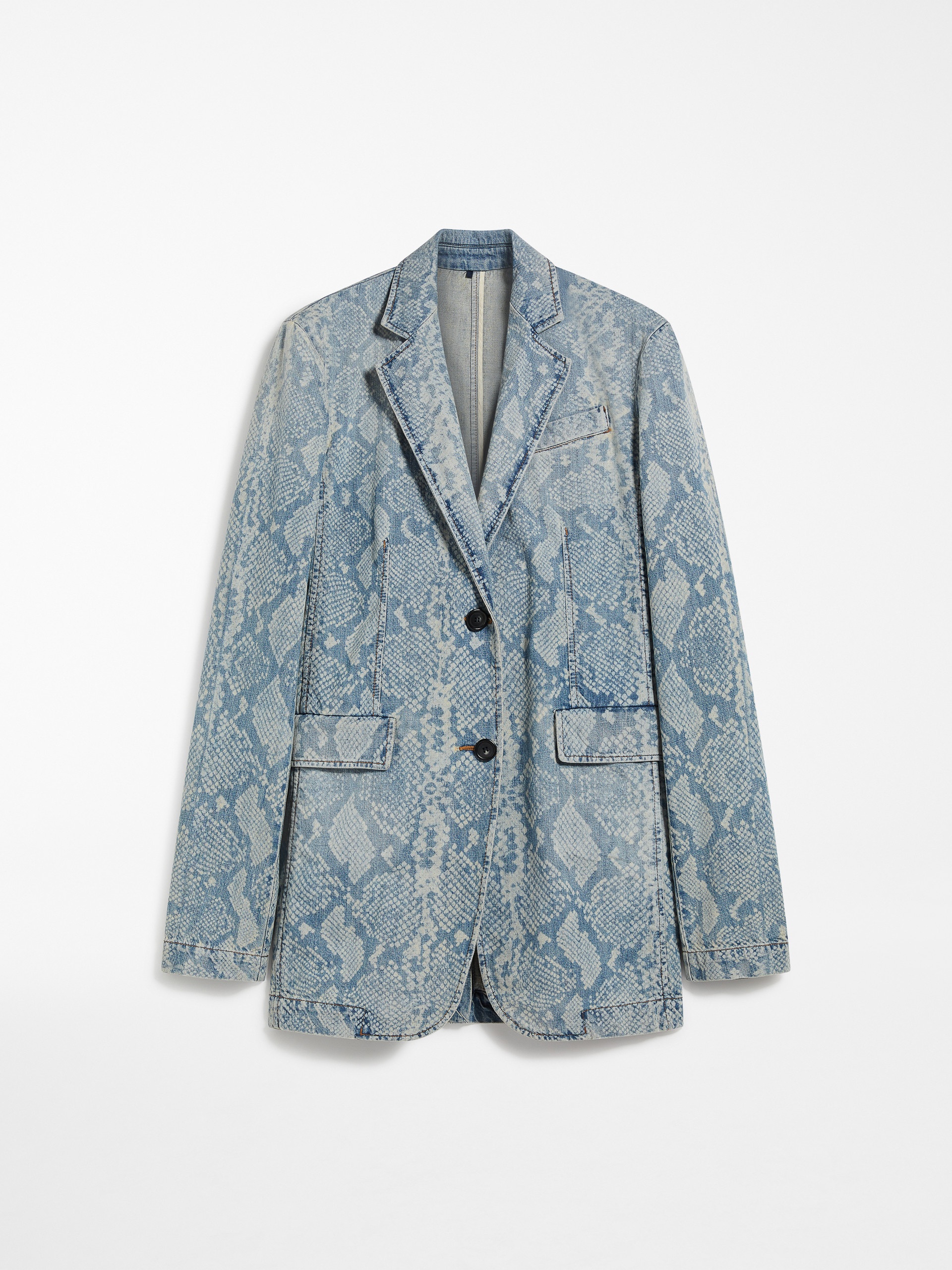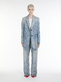 DETAILS Blazer with a large volume, made of indigo denim with a vintage treatment and laser-cut python print. Straight on the bust, it fastens at the front with two buttons, while the flap pockets on the sides, the lapel neckline and the overlapping back slit evoke sartorial constructions. Stitching in contrasting tobacco thread like the iconic denim pieces. COMPOSITION AND CARE 100% cotton. Machine wash cold delicate cycle; do not bleach; do not tumble dry; line drying in the shade; cool iron; professionally dry clean perchloroethylene - mild process.; wash the garment while it is fastened.; don’t iron the labels.; take care when wearing light-coloured clothes or accessories because, with the heat of the body, the indigo fabric , may fade and stain. be careful while sitting on light coloured surfaces, especially if wet. wash garments separately and always turned inside out. hang the garment turned inside out by avoiding to expose it to direct sunlight. avoid removing isolated stains. Distributed by Max Mara S.r.l., registered office in Reggio Emilia (Italy), Via Giulia Maramotti 4, 42124 (IT)