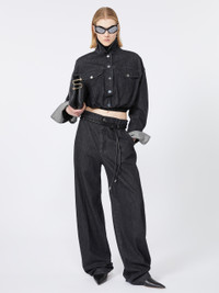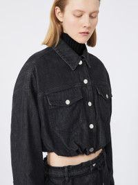 DETAILS Light and soft black denim jacket with volume emphasized by the elasticated insert at the hem. The stitching runs along all the structured cuts and highlights the front pockets. Soft, dark indigo denim jacket, garment-treated for a dark, clean effect Shirt collar Closure with customised metal buttons Pockets with yoke at the front Matching stitching all over the garment Gathered detail at the garment hem Regular fit COMPOSITION AND CARE 100% cotton. Machine wash cold delicate cycle; do not bleach; do not tumble dry; line drying in the shade; cool iron; professionally dry clean perchloroethylene - mild process.; wash the garment while it is fastened.; do not iron the buttons.; take care when wearing light-coloured clothes or accessories because, with the heat of the body, the denim fabric that comes into contact with them may bleed and stain. be careful while sitting on pale colored surfaces, especially if wet. wash denim items separately and always turned inside out. hang the garment turned inside out by avoiding to expose it to direct sunlight. avoid removing isolated stains. Distributed by Max Mara S.r.l., registered office in Reggio Emilia (Italy), Via Giulia Maramotti 4, 42124 (IT)