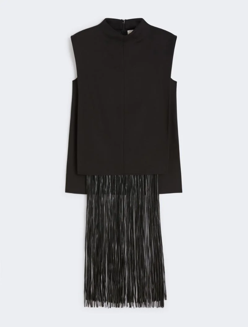 Sleeveless top with straight cut on the bodice and raised collar. The overlapping panel at the front and back creates a play of asymmetries, covering the detachable insert with long fringe. - Sleeveless top in double cotton and viscose cady - Straight fit. - Raised collar - Sleeveless model with overlapping panels on the front and back and side slits - Removable thin fringe motif - Regular fit Composition and Care Fabric 53% cotton, 47% viscose; lining 70% acetate, 30% polyester; decorations in 100% polyester; coating polyurethane. Do not wash; do not bleach; do not tumble dry; cool iron; professionally dry clean perchloroethylene - mild process; do not wet clean.; remove the decorations before washing. Distributed by Max Mara S.r.l., registered office in Reggio Emilia (Italy), Via Giulia Maramotti 4, 42124