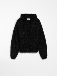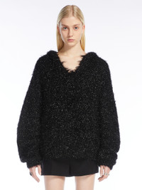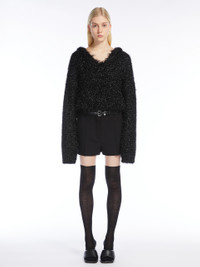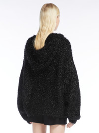 DETAILS Oversized sweater in long-pile lurex yarn. The model boasts a sporty-style maxi hood, dropped armholes, and rib-knit detail on the cuffs and hem. Hip-length model. COMPOSITION AND CARE 56% polyamide, 44% metallised fiber. Hand wash cold; do not bleach; do not tumble dry; flat drying in the shade; cool iron; professionally dry clean perchloroethylene - mild process; do not wet clean.; iron with a cloth between.; using neutral detergent. Distributed by Max Mara S.r.l., registered office in Reggio Emilia (Italy), Via Giulia Maramotti 4, 42124 (IT)