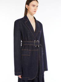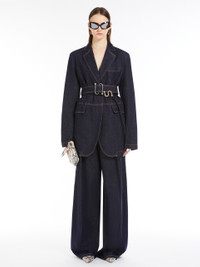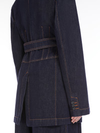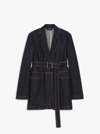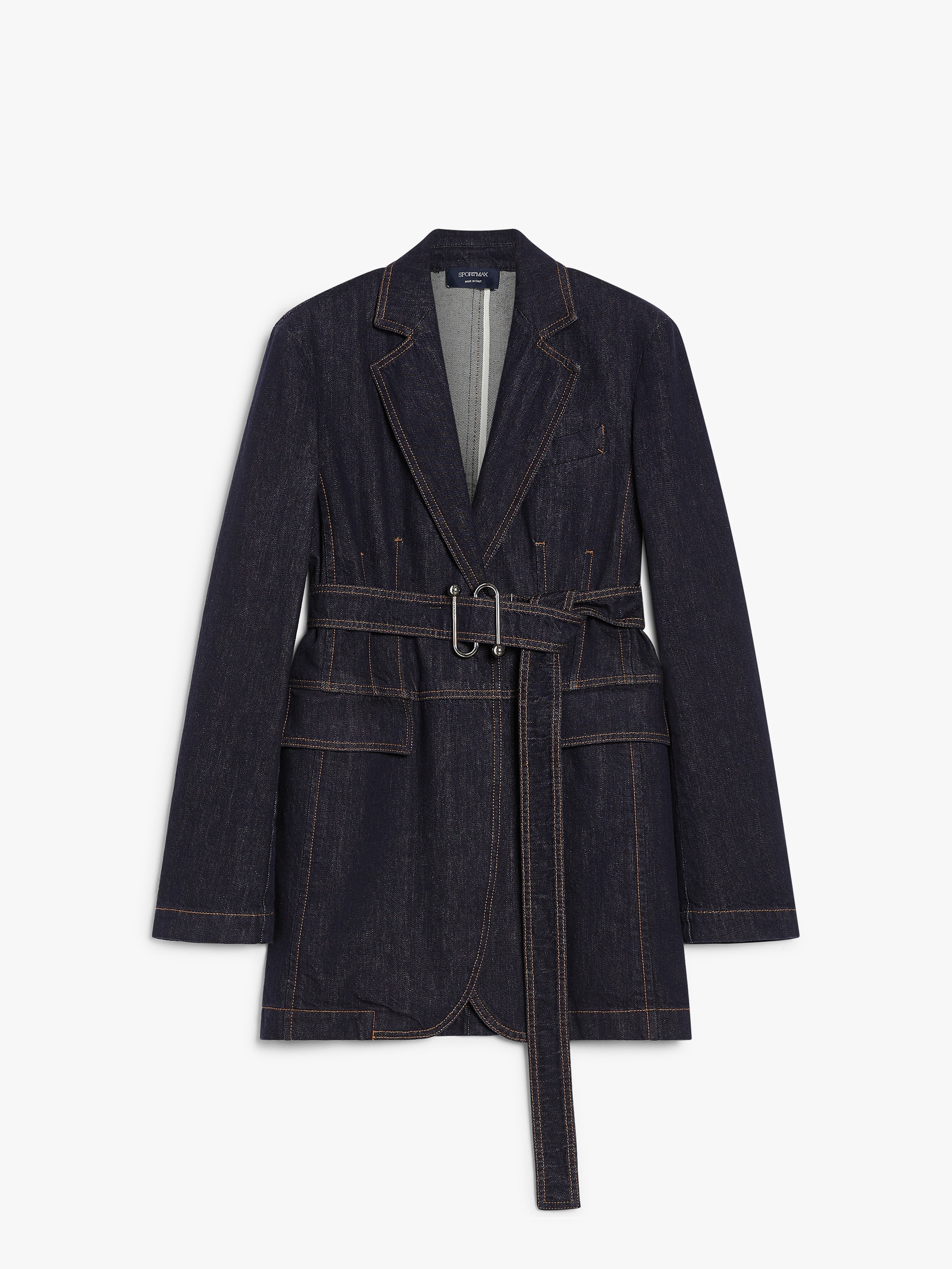 DETAILS Oversized blazer in pure cotton, clean effect yarn-dyed denim, with a tailored construction on the shoulders, lapel neckline. The belt with a buckle defines the silhouette at the waist, while the sides are completed by flap pockets. COMPOSITION AND CARE 100% cotton. Machine wash cold delicate cycle; do not bleach; do not tumble dry; line drying in the shade; cool iron; do not dry clean.; put this item into a string bag before washing it.; wash the garment while it is fastened.; remove the buckle before washing. Distributed by Max Mara S.r.l., registered office in Reggio Emilia (Italy), Via Giulia Maramotti 4, 42124 (IT)