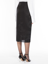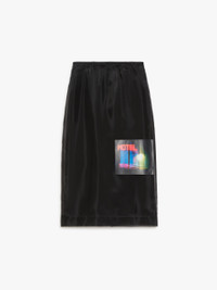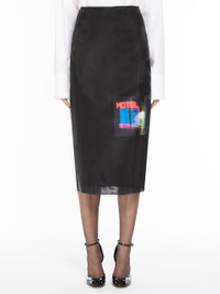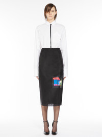 DETAILS Midi skirt made of technical organza and decorated with a printed applique on the front. The simple construction features front and back darts, a wide topstitched hem and a small belt at the waist. COMPOSITION AND CARE Fabric 100% polyester; lining 100% polyester. Machine wash cold delicate cycle; do not bleach; do not tumble dry; line drying in the shade; cool iron; professionally dry clean perchloroethylene - mild process.; wash the garment while it is fastened.; do not iron trimmings.; turn the articles inside out before washing. Distributed by Max Mara S.r.l., registered office in Reggio Emilia (Italy), Via Giulia Maramotti 4, 42124 (IT)