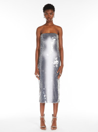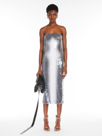 DETAILS Midi dress made of printed, gradient technical jersey, embellished with all-over embroidered transparent sequins. The construction is sleeveless, with a straight neckline and lined bustier to provide support. Side closure with concealed zip. Regular fit. COMPOSITION AND CARE Jersey fabric 95% polyamide, 5% elastane; joining thread 100% polyester; lining 1 94% polyamide, 6% elastane; lining 2 78% polyamide, 22% elastane; - exclusive of decoration. Hand wash cold; do not bleach; do not tumble dry; flat drying in the shade; do not iron; do not dry clean; do not wet clean.; using neutral detergent.; don’t rub. Distributed by Max Mara S.r.l., registered office in Reggio Emilia (Italy), Via Giulia Maramotti 4, 42124 (IT)