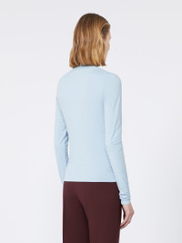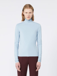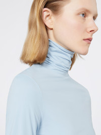 DETAILS Tight-fitting jersey bodycon jumper, with long sleeves and a high neck. Jersey bodycon polo-neck Fitted High neck Fitted COMPOSITION AND CARE Jersey fabric 80% polyamide, 20% elastane; lining 80% polyamide, 20% elastane. Hand wash cold (40°c max); do not bleach; do not tumble dry; flat drying in the shade; cool iron; professionally dry clean perchloroethylene - mild process; do not wet clean.; iron with a cloth between.; using neutral detergent.; don’t rub.; turn the articles inside out before washing.; to be ironed on reverse. Distributed by Max Mara S.r.l., registered office in Reggio Emilia (Italy), Via Giulia Maramotti 4, 42124 (IT)
