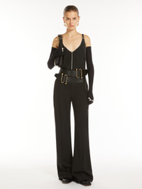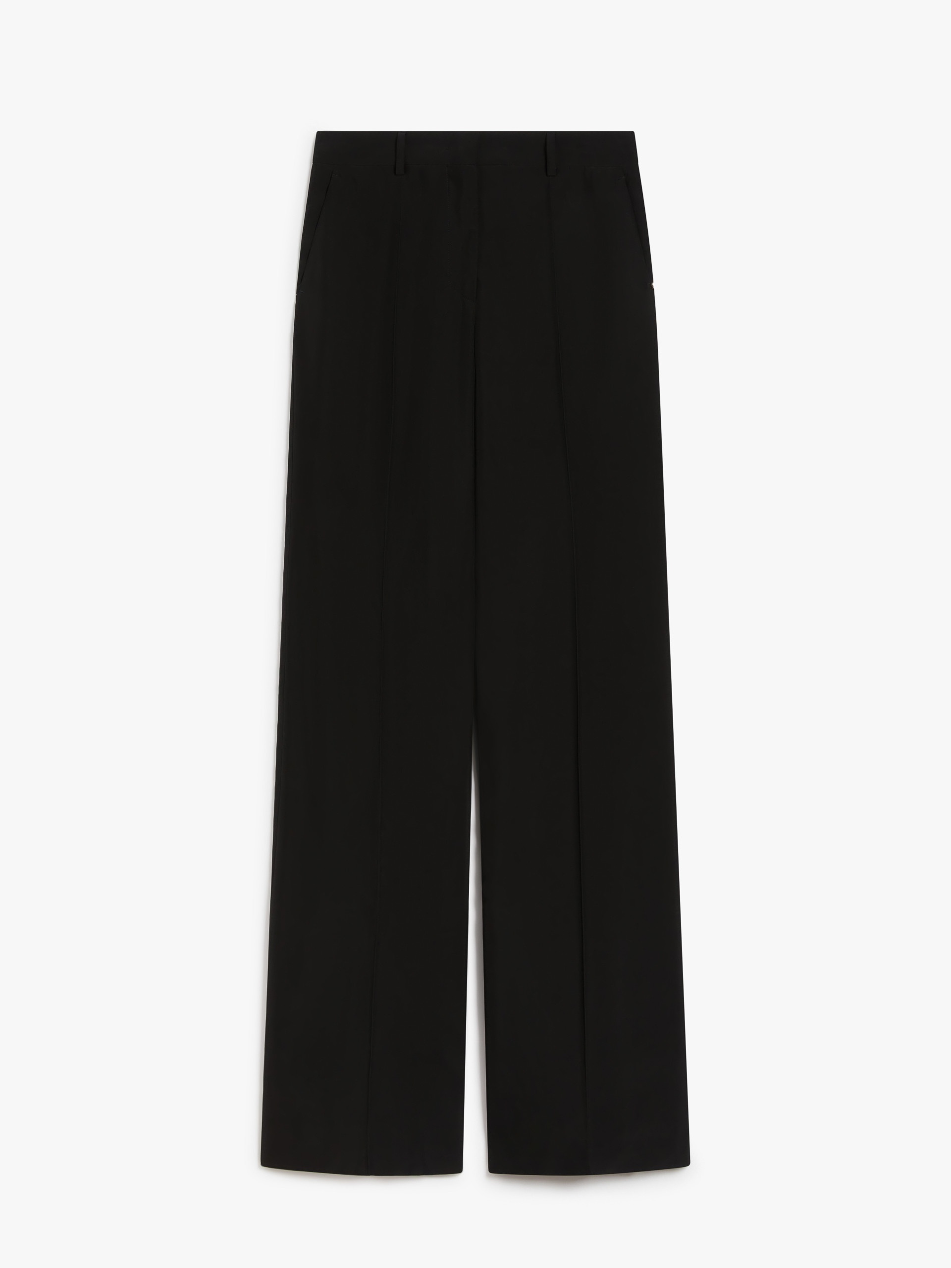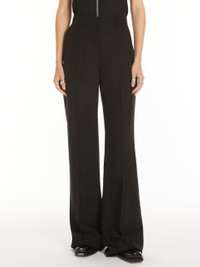 DETAILS Trousers in washed viscose canvas, with a flared line and slightly low waist. The internal construction with a custom waistband evokes men’s tailoring, as do the slanted side pockets and back double-welt pockets. The trouser crease and stitching with matching shiny thread complete the design. Regular fit. The garment comes with a raw hem, allowing you to customise the length to your liking. COMPOSITION AND CARE 100% viscose. Do not wash; do not bleach; do not tumble dry; cool iron; professionally dry clean perchloroethylene - mild process; do not wet clean. Distributed by Max Mara S.r.l., registered office in Reggio Emilia (Italy), Via Giulia Maramotti 4, 42124 (IT)