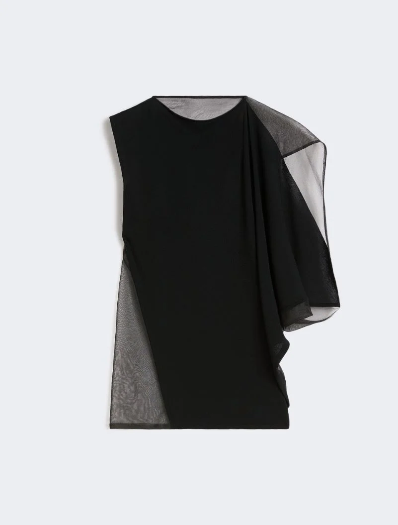 Wraparound top featuring a draped front and criss-cross panels on the back. The two materials, viscose and sheer knit fabric, mould to the geometric cuts, leaving the back partially uncovered. - Stretch viscose knit top with sheer technical yarn inserts - Asymmetrical neckline - Wraparound design with a draped front - Sheer knit inserts - Regular fit Composition and Care Knitted fabric 1 85% viscose, 15% polyester; knitted fabric 2 100% polyester. Do not wash; do not bleach; do not tumble dry; cool iron; professionally dry clean perchloroethylene - mild process; do not wet clean.; iron with a cloth between. Distributed by Max Mara S.r.l., registered office in Reggio Emilia (Italy), Via Giulia Maramotti 4, 42124