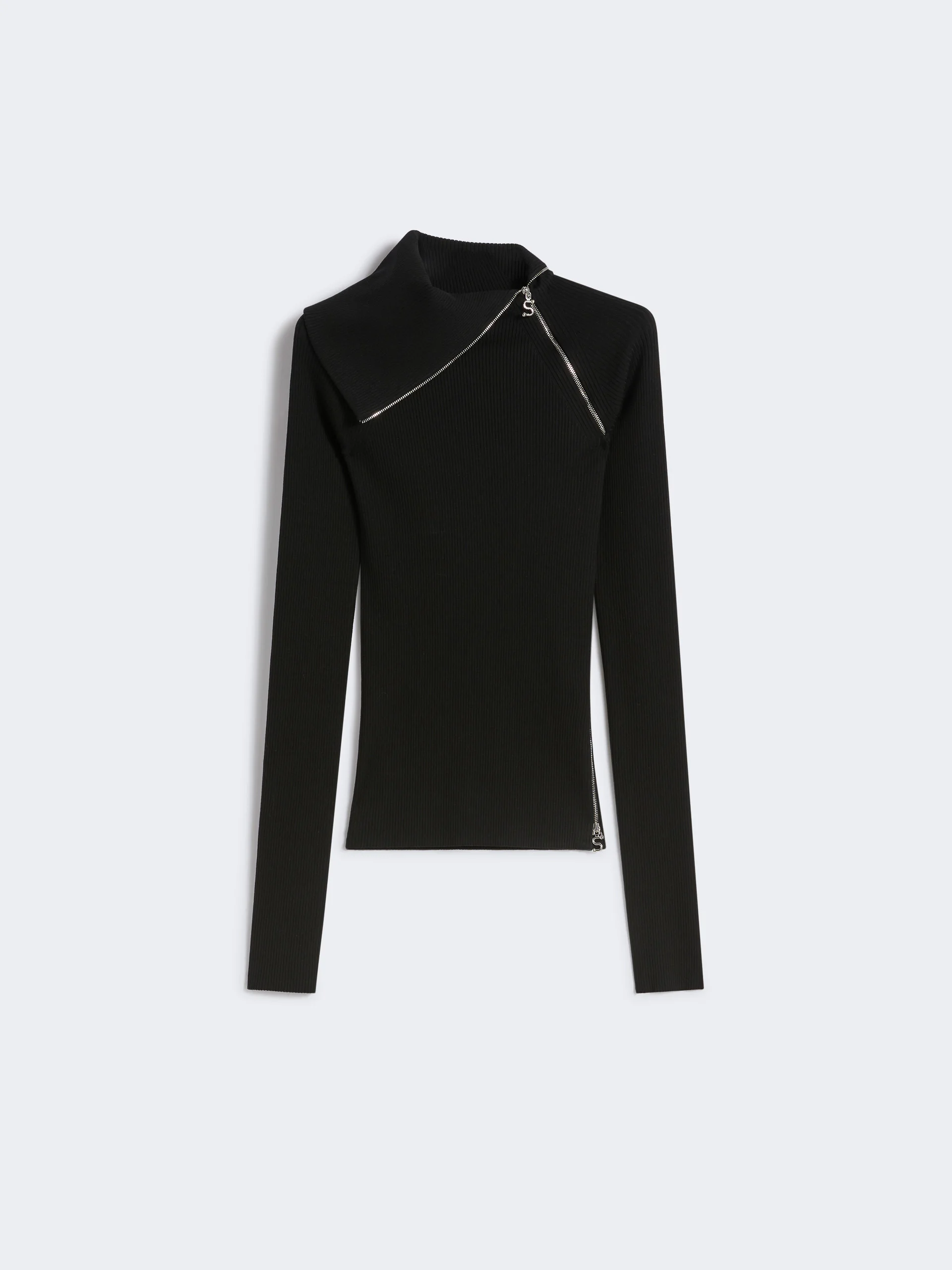 DETAILS Wool-blend jumper in a stretch yarn that accentuates the silhouette. The special collar construction with diagonal zip, and second zip on the left, adds a sporty note to the design. Jumper made of a stretch wool-blend yarn Fitted High neck with contrasting interior Diagonal zip opening on neck and left shoulder Side zip opening on the left side Raglan sleeves Fitted COMPOSITION AND CARE 100% virgin wool. Hand wash cold (40°c max); do not bleach; do not tumble dry; flat drying in the shade; cool iron; professionally dry clean perchloroethylene - mild process; do not wet clean.; iron with a cloth between.; using neutral detergent.; protect accessories before washing. Distributed by Max Mara S.r.l., registered office in Reggio Emilia (Italy), Via Giulia Maramotti 4, 42124 (IT)