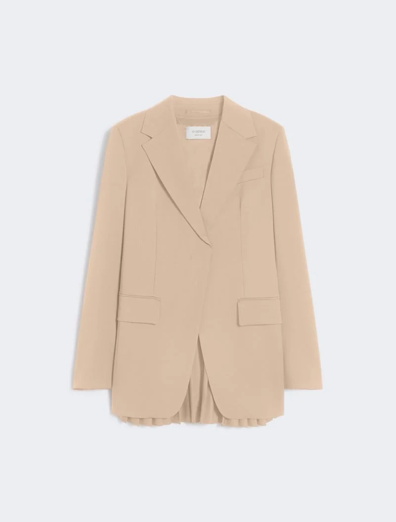 Blazer with a tailored construction, concealed buttoning and a slightly cut-away line to the hem. The pleated back is accented by a sleek metal chain belt, which can be removed for personalised styling. - Natural stretch pure wool canvas blazer - Lapel neckline and single-breasted fastening with concealed button - Pleated back with side slits and removable metal chain - Pockets with double welt and flap - Regular fit Composition and Care Fabric 55% virgin wool, 45% polyester; lining 70% acetate, 30% polyester; sleeves lining 97% viscose, 3% acetate. Do not wash; do not bleach; do not tumble dry; cool iron; professionally dry clean perchloroethylene - mild process; do not wet clean.; wash the garment while it is fastened.; after washing fix the pleats by ironing them.; remove the chain before washing. Distributed by Max Mara S.r.l., registered office in Reggio Emilia (Italy), Via Giulia Maramotti 4, 42124