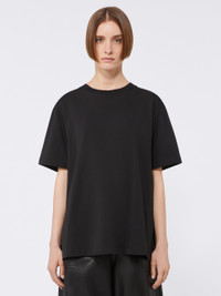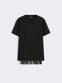 DETAILS Regular fit T-shirt in soft cotton jersey, with original loose fringe detail on the lower back. Pure cotton jersey T-shirt Straight, regular fit Rounded neckline finished with ribbing Short sleeve Detail of long fringes in coated jersey on the back Fit COMPOSITION AND CARE Jersey fabric 100% cotton; decorations 100% polyester; layer polyurethanic resin. Machine wash cold delicate cycle; do not bleach; do not tumble dry; flat drying in the shade; cool iron; professionally dry clean perchloroethylene - mild process; professional wet cleaning - very mild process.; iron with a cloth between.; using neutral detergent.; before cleaning the style remove the accessories. Distributed by Max Mara S.r.l., registered office in Reggio Emilia (Italy), Via Giulia Maramotti 4, 42124 (IT)