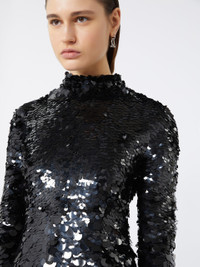 DETAILS Short dress with a supported construction, featuring darts and side panels that cinch the waist and round the hips. Kimono sleeves for a graphic touch. Jersey dress embroidered with gradient-effect sequins Slim-fit at the waist with rounded hips Raised collar with concealed back zip Kimono sleeves Darts at the waist and shaped side panels COMPOSITION AND CARE Jersey fabric 100% polyester; joining thread 100% polyester; lining 1 62% acetate, 38% polyester; lining 2 100% polyamide; - exclusive of decoration. Hand wash cold (40°c max); do not bleach; do not tumble dry; flat drying in the shade; do not iron; do not dry clean; do not wet clean.; using neutral detergent.; don’t rub.; turn the articles inside out before washing. Distributed by Max Mara S.r.l., registered office in Reggio Emilia (Italy), Via Giulia Maramotti 4, 42124 (IT)