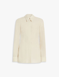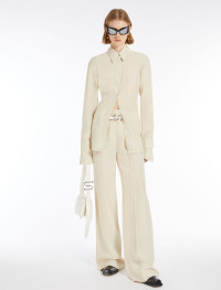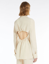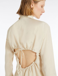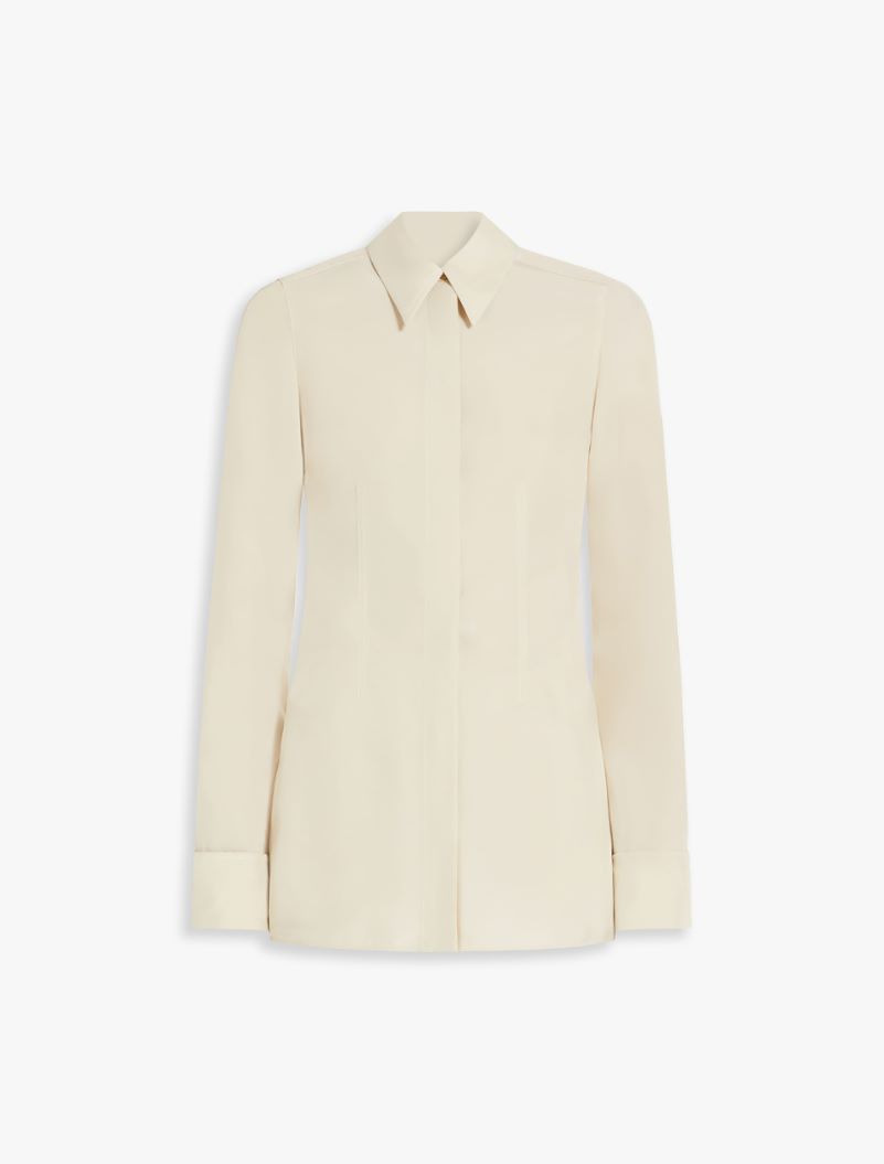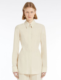 Shirt made from washed viscose canvas, with darts at the front for a feminine line and covered buttoning. The back features a gathered opening that leaves part of the back bare. There is all-over stitching in a slightly contrasting coloured shiny thread. Double-width cuffs to be worn turned back. Regular fit. Composition and Care 100% viscose. Do not wash; do not bleach; do not tumble dry; cool iron; professionally dry clean perchloroethylene - mild process; do not wet clean. Distributed by Max Mara S.r.l., registered office in Reggio Emilia (Italy), Via Giulia Maramotti 4, 42124