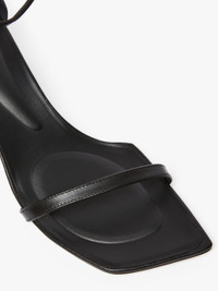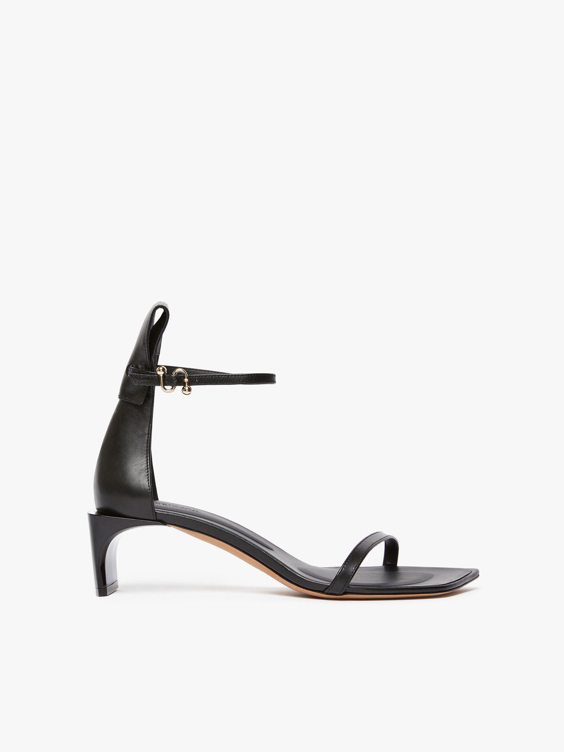 DETAILS Nappa-leather sandals with a 4.5 cm shiny patent-leather heel. Strap on the front and ankle fastening with an "S" shaped metal buckle recalling the Sportmax logo. The style features an oversized loop at the back. COMPOSITION AND CARE Upper in lamb leather; lining in lamb leather; sole in leather. Distributed by Max Mara S.r.l., registered office in Reggio Emilia (Italy), Via Giulia Maramotti 4, 42124 (IT)