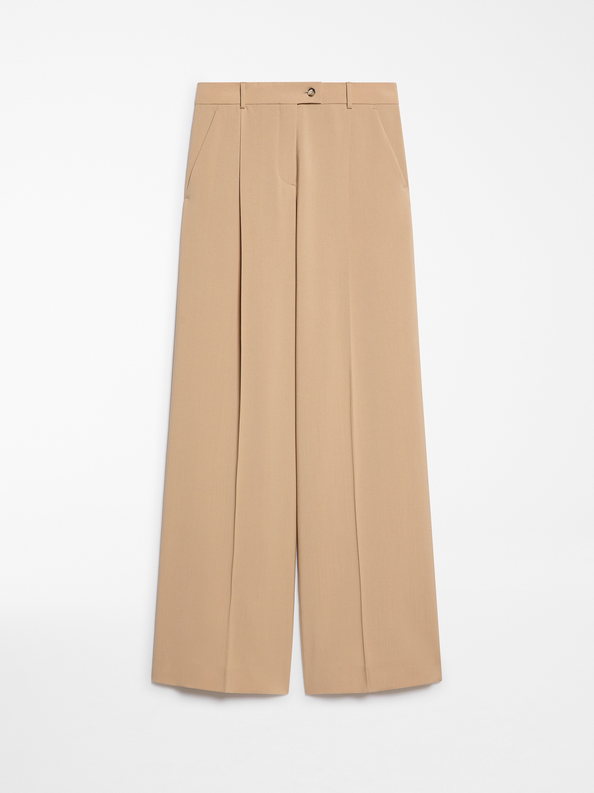 DETAILS Men’s-style trousers, made of natural-stretch pure-wool canvas, with an oversize fit and wide leg. The waistband with tab and button is inspired by tailored styles, as are the pressed pleats under the waistline that extend down the entire leg, the side slant pockets and rear welt pockets. The customised inner waistband adds an exclusive note. COMPOSITION AND CARE 100% virgin wool. Do not wash; do not bleach; do not tumble dry; cool iron; professionally dry clean perchloroethylene - mild process; do not wet clean.; put this item into a string bag before washing it.; wash the garment while it is fastened.; turn the articles inside out before washing. Distributed by Max Mara S.r.l., registered office in Reggio Emilia (Italy), Via Giulia Maramotti 4, 42124 (IT)