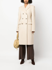 long-sleeved virgin wool double-breasted coat Highlights - Sand beige - Virgin wool - Vertical seamed - Peak lapels - Double-breasted button fastening - Long sleeves - Chest welt pocket - Two front flap pockets - Central rear vent - Mid-length Imported Composition Lining: Polyester 100% Outer: Virgin Wool 100% Washing instructions Dry Clean Only