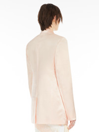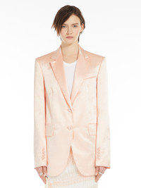DETAILS Blazer with oversized volume and masculine construction, made of garment-washed acetate satin with crinkled effect. The decisive shoulders are lightly padded and combined with a masculine lapel with buttonhole and sartorial-inspired melton detail. Low fastening with two customised buttons, and sleeves with a forward-turned construction for a modern look. The style is completed by a diagonal pocket on the chest, two side welt pockets with flap and a central overlapping rear slit. Lined. COMPOSITION AND CARE Fabric 100% acetate; lining 70% acetate, 30% polyester; sleeves lining 97% viscose, 3% acetate. Do not wash; do not bleach; do not tumble dry; cool iron; professionally dry clean perchloroethylene - mild process; do not wet clean.; wash the garment while it is fastened.; don’t iron the labels.; turn the articles inside out before washing. Distributed by Max Mara S.r.l., registered office in Reggio Emilia (Italy), Via Giulia Maramotti 4, 42124 (IT)