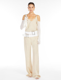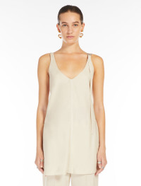 Top made of washed viscose canvas, with a deep neckline at both the front and back. The thin shoulder straps are adjustable at the front left thanks to an S-shaped metal loop, and at the back right with a metal ring. The style is completed by deep slits at the sides and by a play of contrasting stitching all over, created with shiny thread. There is a patterned stitching on the central lines, front and back. Regular fit. Composition and Care Fabric 100% viscose; lining 100% viscose. Do not wash; do not bleach; do not tumble dry; cool iron; professionally dry clean perchloroethylene - mild process; do not wet clean.; put this item into a string bag before washing it. Distributed by Max Mara S.r.l., registered office in Reggio Emilia (Italy), Via Giulia Maramotti 4, 42124