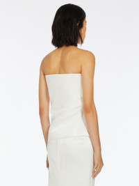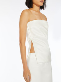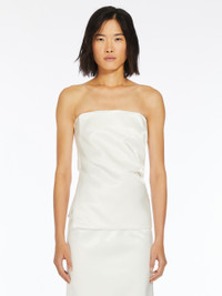 DETAILS Sleeveless top with a bustier construction and straight neckline. The internal bodice with boning supports the external part, defined by a delicate draping on the bust. The style opens on the right side with a concealed zip and slit in the hem. The style has removable adjustable lingerie shoulder straps. COMPOSITION AND CARE Fabric 77% cotton, 23% polyamide; fabric 2 67% cotton, 33% flaxlinen; lining 97% cotton, 3% elastane. Hand wash cold; do not bleach; do not tumble dry; line drying in the shade; cool iron; professionally dry clean perchloroethylene - mild process; do not wet clean.; don’t iron the labels.; remove the straps before washing. Distributed by Max Mara S.r.l., registered office in Reggio Emilia (Italy), Via Giulia Maramotti 4, 42124 (IT)
