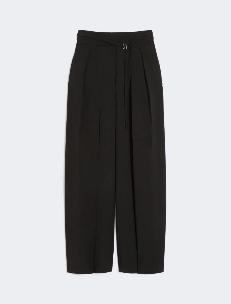 Wide-leg trousers with a waist accentuated by pleats and a double-wrap belt with a metal S-shaped buckle. - Natural stretch pure wool canvas trousers - Double-wrap fabric belt with S-shaped metal buckle - Double pleat at the waist - In-seam side pockets and rear welt pockets - Regular fit Composition and Care 100% virgin wool. Do not wash; do not bleach; do not tumble dry; cool iron; professionally dry clean perchloroethylene - mild process; do not wet clean.; wash the belt in a net sack. Distributed by Max Mara S.r.l., registered office in Reggio Emilia (Italy), Via Giulia Maramotti 4, 42124