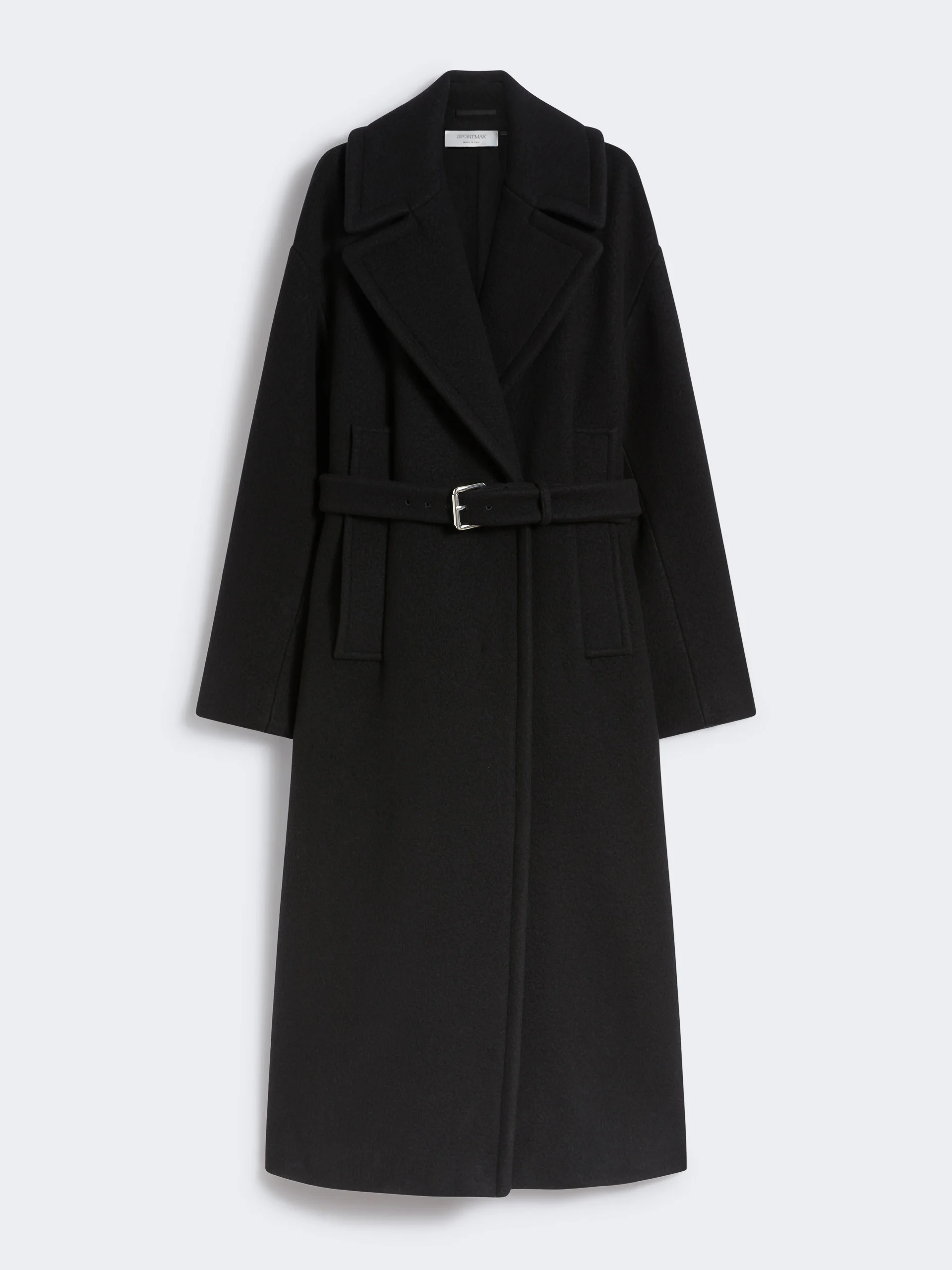 DETAILS Oversized coat in soft double pure wool, with large lapels and stitching details along the structured cuts. The belt with metal buckle cinches the waist to adjust the silhouette. Double pure virgin wool coat Oversize fit Neckline with bold lapel and stitching along all the cuts Hidden button fastening and belt with metal buckle Flap pockets on the sides and central back slit Oversize fit COMPOSITION AND CARE Fabric 100% virgin wool; lining 50% acetate, 50% viscose. Do not wash; do not bleach; do not tumble dry; cool iron; professionally dry clean perchloroethylene - mild process; do not wet clean.; wash the garment while it is fastened.; wash the belt in a net sack. Distributed by Max Mara S.r.l., registered office in Reggio Emilia (Italy), Via Giulia Maramotti 4, 42124 (IT)