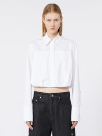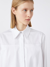 DETAILS Pure cotton poplin shirt with short waist line. The gathering at the hem, stitched yoke and inserted pocket are inspired by sports jackets, reimagined in a feminine style. Pure cotton poplin shirt Boxy fit Shirt collar Hidden button fastening Customised metal buttons on the collar and cuffs Gathering at the hem Regular fit COMPOSITION AND CARE 100% cotton. Machine wash cold delicate cycle; do not bleach; do not tumble dry; line drying in the shade; cool iron; professionally dry clean perchloroethylene - mild process. Distributed by Max Mara S.r.l., registered office in Reggio Emilia (Italy), Via Giulia Maramotti 4, 42124 (IT)