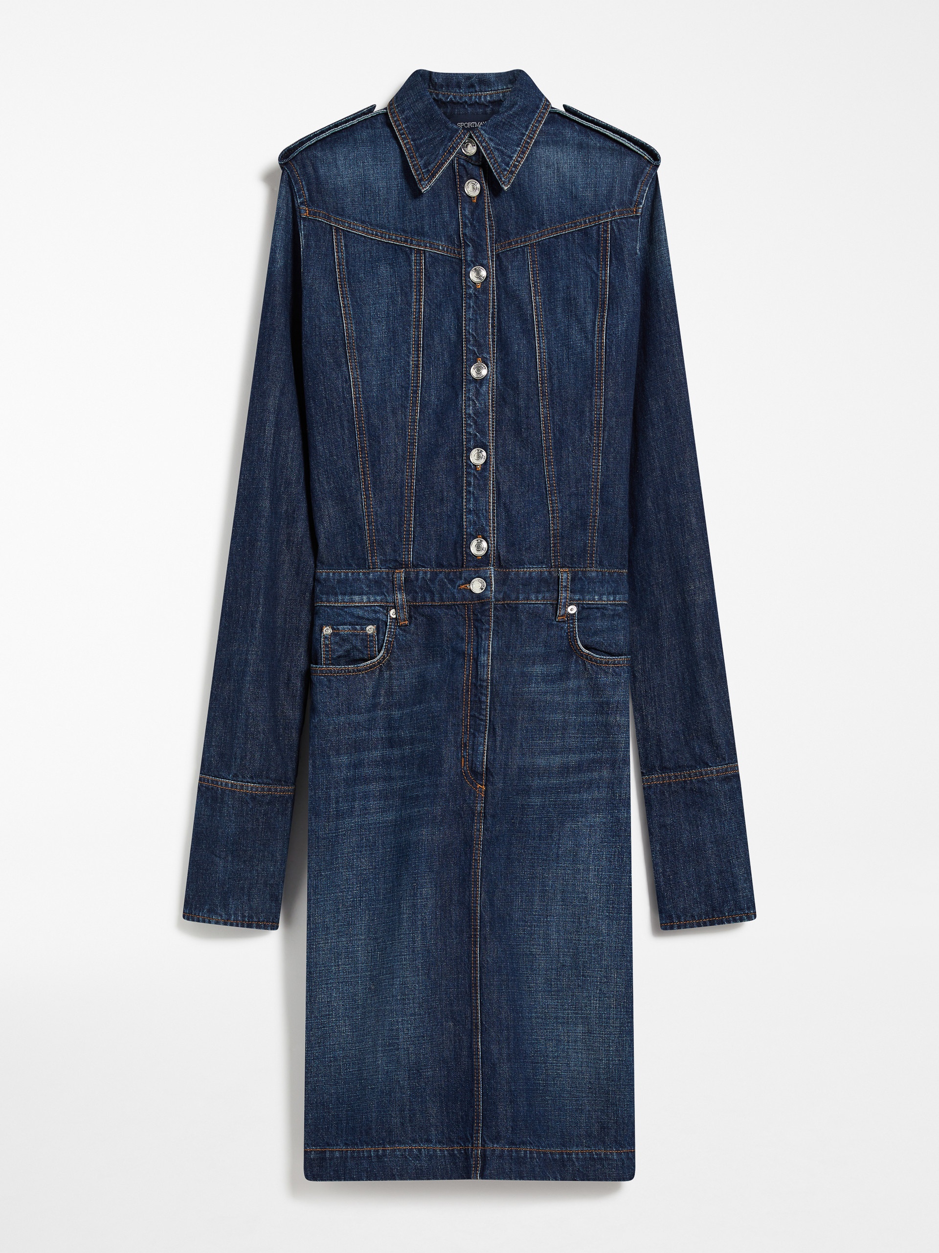 DETAILS Shirt dress in authentic indigo denim, with a vintage dark wash. The construction plays with seams and shaping for a trompe-l’oeil effect: at the top, a long-sleeved shirt, double-length cuffs to wear turned up, epaulettes on the shoulders and a stand collar. At the bottom, a straight skirt with five pockets and a fake fastening with a tack button and rivets. Back slit for ease of movement. COMPOSITION AND CARE 100% cotton. Machine wash cold delicate cycle; do not bleach; do not tumble dry; line drying in the shade; cool iron; do not dry clean.; don’t iron the labels.; take care when wearing light-coloured clothes or accessories because, with the heat of the body, the indigo fabric , may fade and stain. be careful while sitting on light coloured surfaces, especially if wet. wash garments separately and always turned inside out. hang the garment turned inside out by avoiding to expose it to direct sunlight. avoid removing isolated stains.; contains non-textile parts of animal origin. Distributed by Max Mara S.r.l., registered office in Reggio Emilia (Italy), Via Giulia Maramotti 4, 42124 (IT)