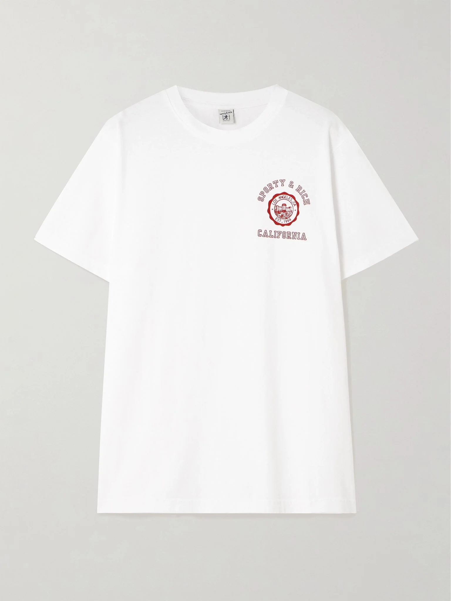 Sporty & Rich's T-shirt is stamped with a crest honoring its LA roots, which is where all its garments are manufactured. It's made from American-grown cotton-jersey that's pre-shrunk and garment-dyed for softness. Size & Fit - Fits true to size, take your normal size - Designed for a slightly loose fit - Lightweight, slightly stretchy fabric - Model is 177cm/ 5'10" and is wearing a size Small Model measurements: - Bust: 85cm/ 33” - Waist: 66cm/ 26” - Hip: 92cm/ 36 Details & Care - White and red cotton-jersey - Slips on - 100% cotton - Machine wash