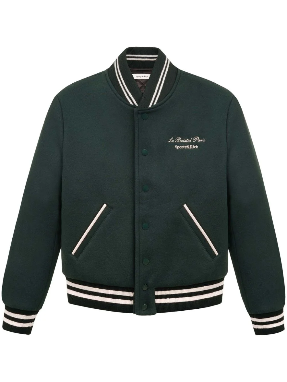Faubourg wool varsity jacket Highlights - Forest green - Stripe trim - Embroidered logo at the chest - Front press-stud fastening - Long sleeves - Ribbed cuffs and hem - Two side slit pockets - Straight hem Imported Composition Nylon 100%