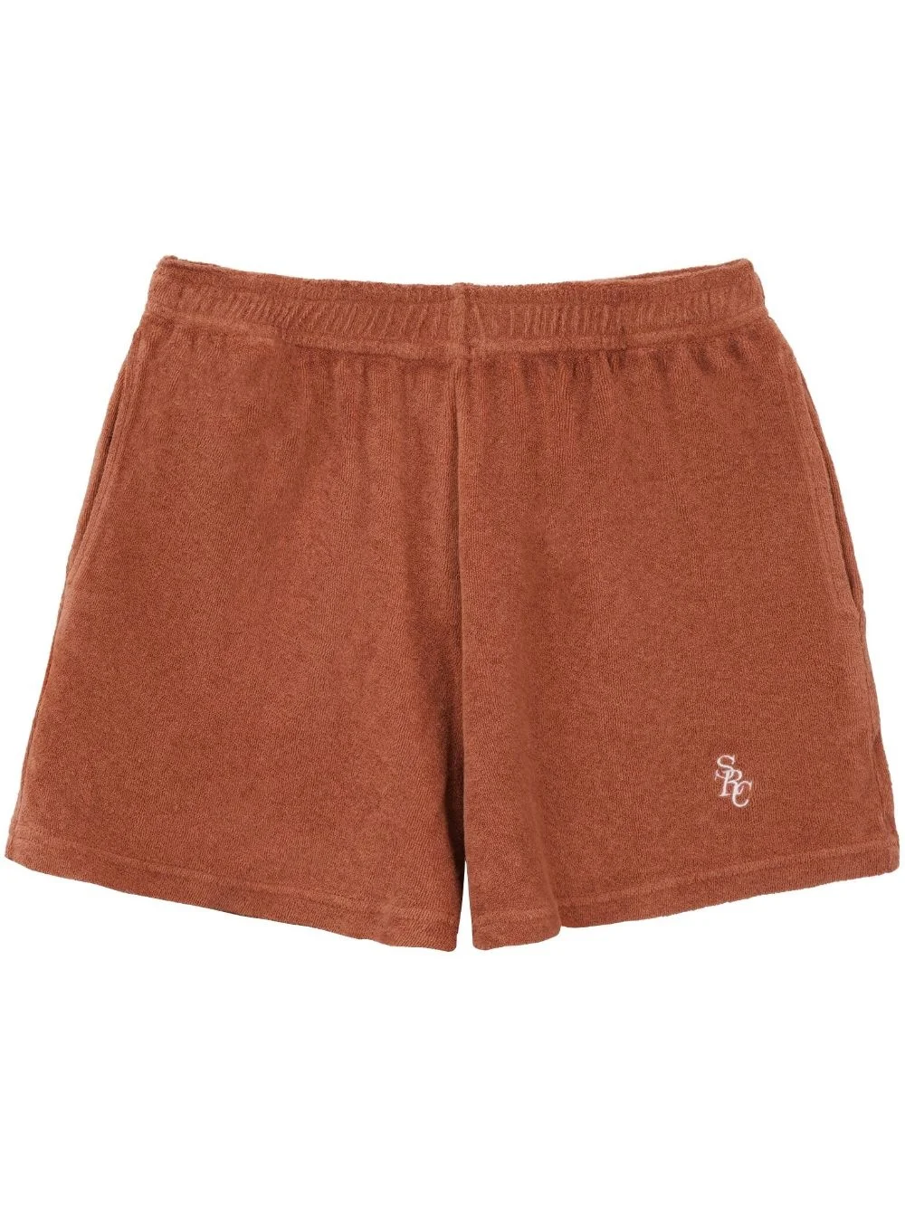 logo-embroidered towelling-finish shorts Highlights - Clay orange - Cotton - Towelling finish - Embroidered logo at the leg - Elasticated waistband - Two side slit pockets - Rear patch pocket - Straight leg Imported Composition Cotton 100%