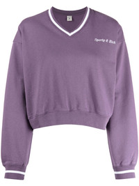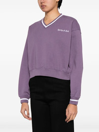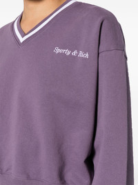 logo-embroidered V-neck sweatshirt Highlights - Purple - Cotton - Embroidered logo at the chest - Stripe detailing - V-neck - Drop shoulder - Long sleeves - Ribbed cuffs - Cropped Imported Composition Cotton 100% SIZE & FIT Model measurements Height 5 ft 10 in(1.77 m) Bust/Chest 31.49 in(80 cm) Hips 35.43 in(90 cm) Waist 25.19 in(64 cm) FittingInformation Designed to be unstructured, offering a loose fit throughout Made from a midweight non-stretch fabric, this piece offers minimal elasticity when worn This piece fits true to size – take your usual size Washing instructions Dry Clean Only