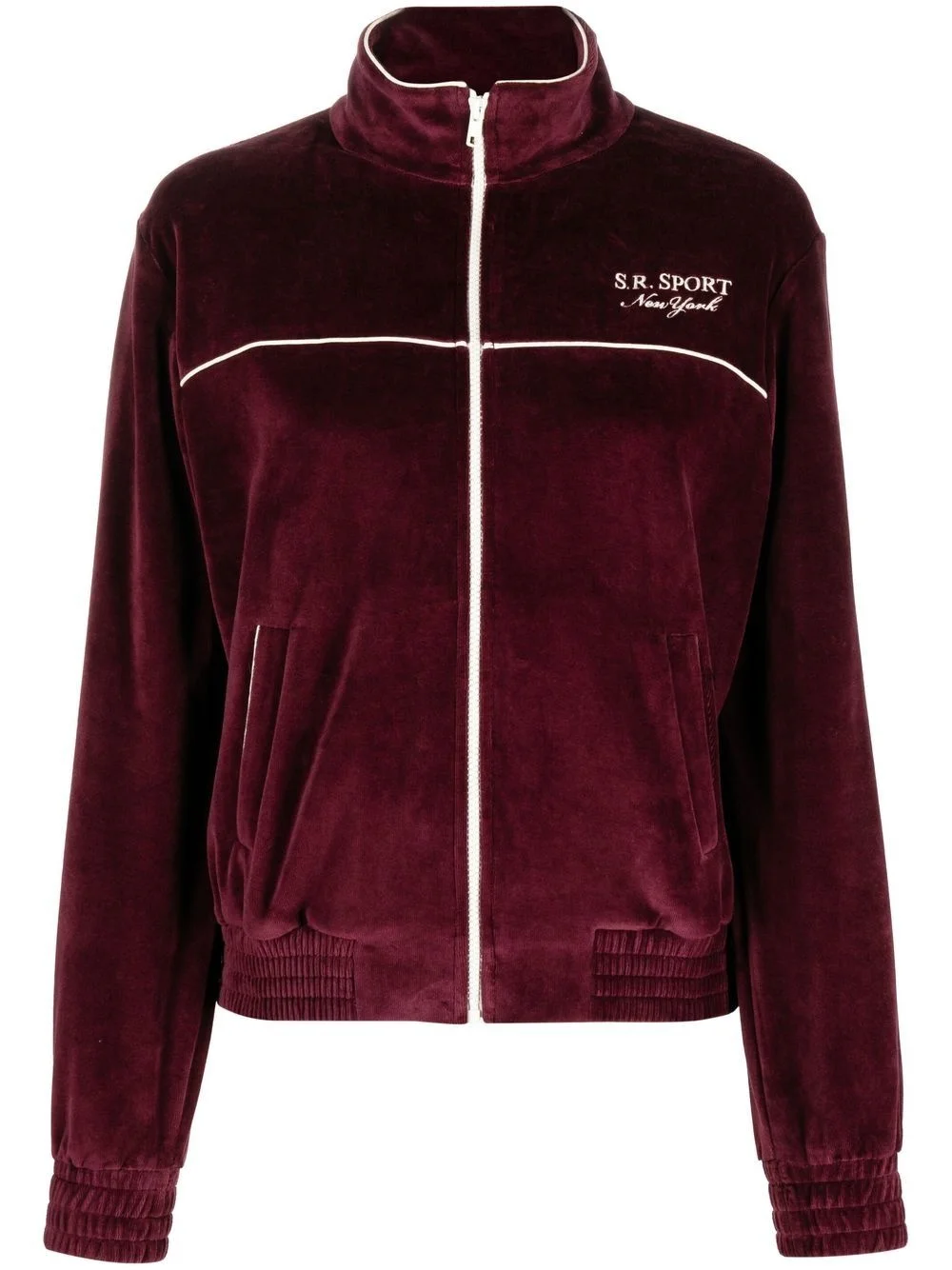 logo-embroidered zipped jacket wine red cotton velvet finish embroidered logo at the chest piped-trim detailing high neck front zip fastening long sleeves slip pockets to the sides elasticated hem Imported Composition Cotton 100% SIZE & FIT FittingInformation This piece fits true to size. We recommend you get your regular size Cut for a relaxed fit Made with a mid-weight fabric Washing instructions Machine Wash