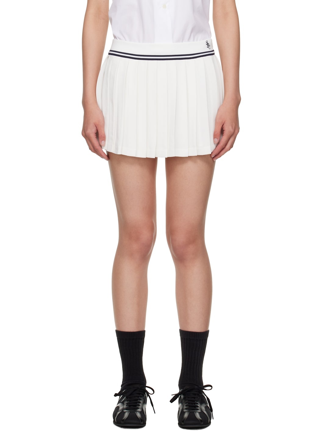 Viscose crepe miniskirt. · Knife pleats throughout · Striped rib-knit waistband · Logo embroidered at front waistband · Zip closure at side seam · Fully lined Supplier color: White/Navy Body: 100% viscose. Trim: 95% polyester, 5% elastane. Lining: 100% polyester. Made in China 252446F090005