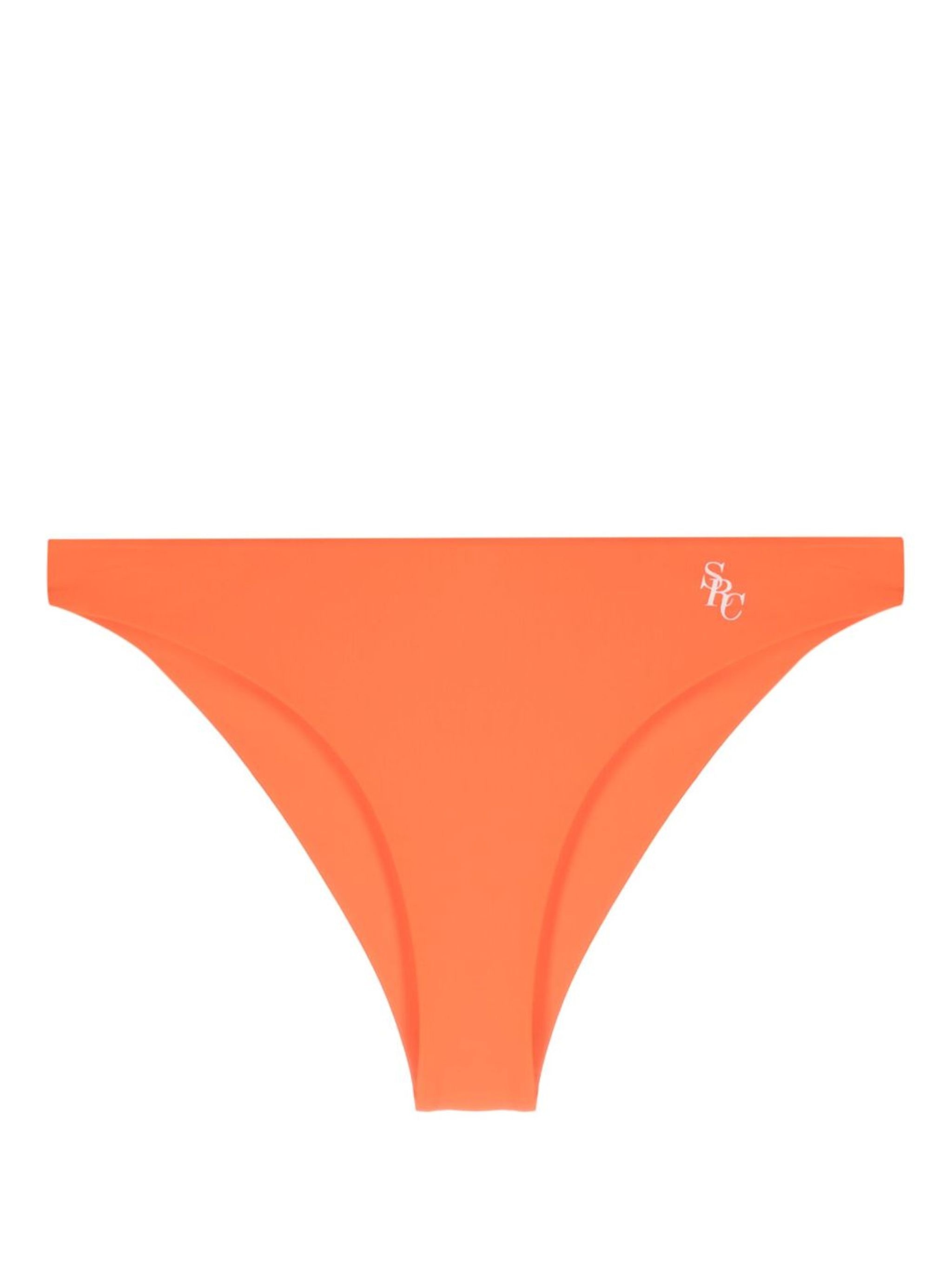 Romy logo-print bikini bottoms from Sporty & Rich featuring tangerine orange, recycled polyamide, stretch-design, logo print to the front, high cut and finished edge. Be mindful to try on swimwear over your own garments.. This item is made from at least 50% recycled or upcycled materials. For recycled synthetic clothing products, we highly recommend using a microfibre-catching washing bag to ensure that no microplastics that can pollute water are released in the process.. Learn more about what makes a product Conscious on our Conscious Criteria page. Size & Fit Model Measurements: Bust: 0cm Height: 0cm Hips: 0cm Waist: 0cm Fabric and Care Designer Style ID: SM975ML Designer Colour: MELON Composition: Elastane 22%, Recycled polyamide 78%, Recycled polyamide 78% Washing instructions: Machine Wash Made in Portugal