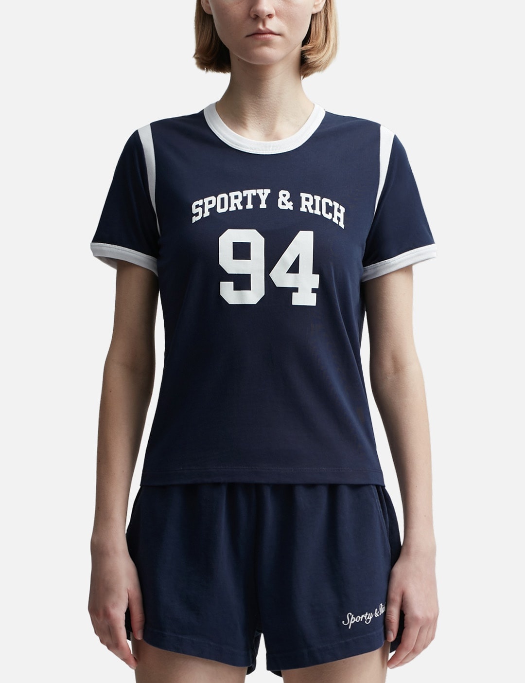 - Sporty & Rich - SR 94 Sports T-shirt - Shrink-free - Contrasting neckline and sleeve - Logo print at front - Straight hem - Color: Navy - Material: 100% Cotton - See more T-Shirts and Clothing SIZING - Model wears size S - Model measures: Height 179cm, Chest 32”/81cm, Waist 23’’/58.42cm, Hip 35’’/88.9cm