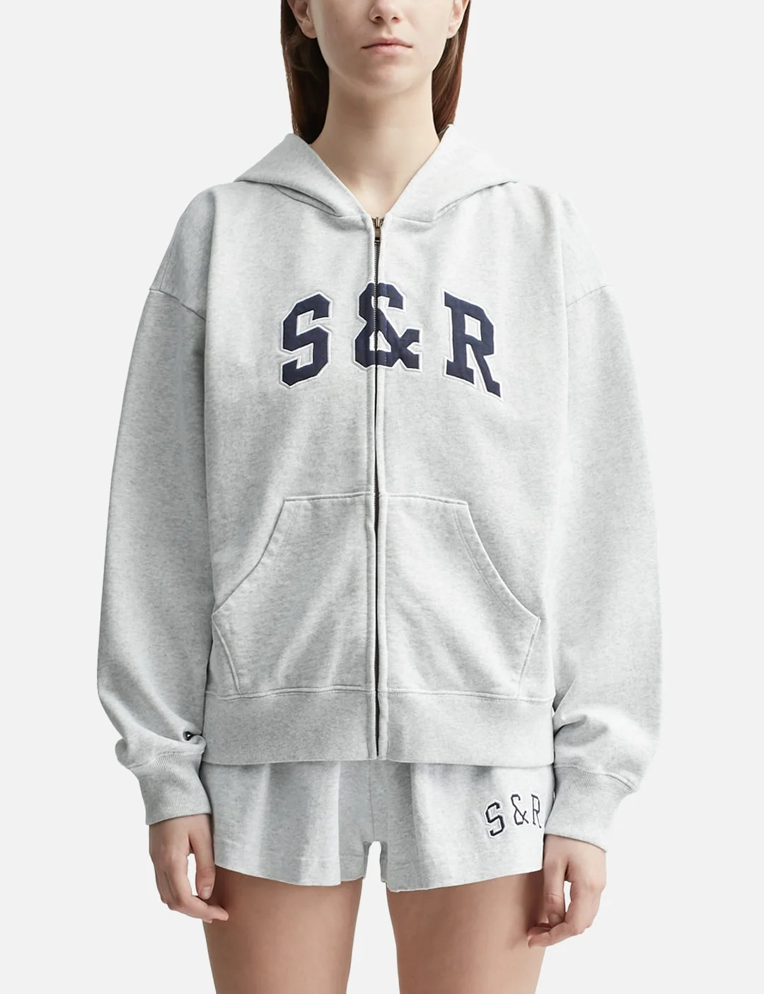 - Sporty & Rich - S&R Ivy Zip Hoodie - Made of 11.5oz cotton - Relaxed fit - Pre-shrunk - Garment-dyed finish - Fixed hood - Front zip closure - Logo embroidery on front - Two front pockets - Ribbed cuffs and hem - Made in Portugal - Color: Heather Gray / Navy - Material: 100% Cotton - See more Hoodies and Clothing - Model wears size S - Model measures: Height 177cm, Chest 30.5’’/77.5cm, Waist 25.5’’/65cm, Hip 35’’/89cm - Vendor Code: S&R Ivy Zip Hoodie