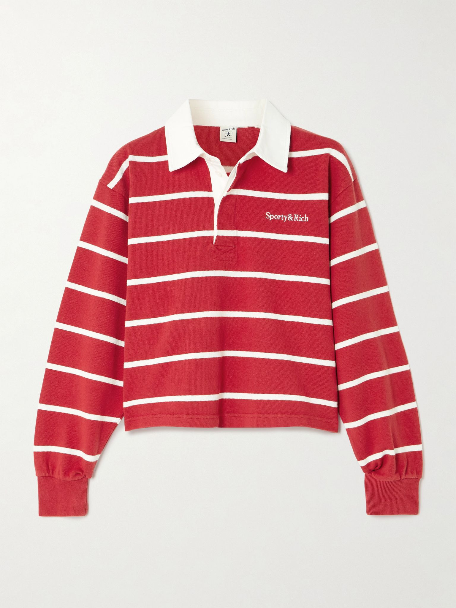 Sporty & Rich's 'Serif' polo shirt embodies modern prep. Modelled on rugby styles, it's made from cotton-jersey in a boxy, cropped shape, has a canvas collar and classic stripes. Wear yours with dark-wash denim and loafers for an easy weekend look. Size & Fit - Fits true to size, take your normal size - Designed for a slightly loose fit - Dropped shoulder seam - Cropped length - Mid-weight, non-stretchy fabric - Model is 177cm/ 5'10" and is wearing a size Small Model measurements: - Bust: 85cm/ 33” - Waist: 66cm/ 26” - Hip: 92cm/ 36” Details & Care - Red and white cotton-jersey, white canvas - Button fastenings along front - 100% cotton - Machine wash