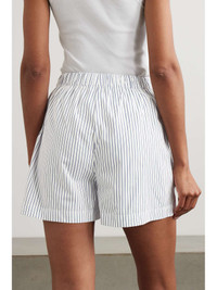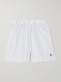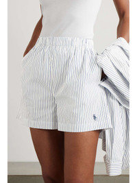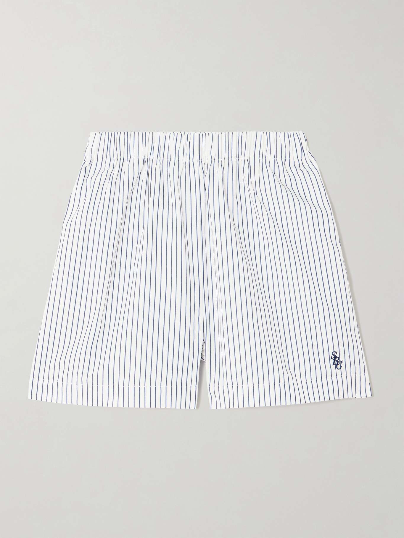 EDITORS'NOTES Classic boxer shorts inform the fit and fabric of Sporty & Rich's 'SRC' shorts. They're cut from airy cotton-poplin, patterned with uniform stripes and have an elasticated waistband. Wear yours with socks and loafers to complement the preppy mood. SIZE & FIT Model measurements: - Fits true to size, take your normal size - Designed for a relaxed fit - High-rise, cut for a slightly loose fit - Mid-weight, non-stretchy fabric - Model is 177cm/ 5'10" and is wearing a size Small - Bust: 77cm/ 30.5" - Waist: 62cm/ 24.5" - Hip: 88cm/ 34.5" DETAILS & CARE - White and navy cotton-poplin - Pull on - 100% cotton - Machine wash
